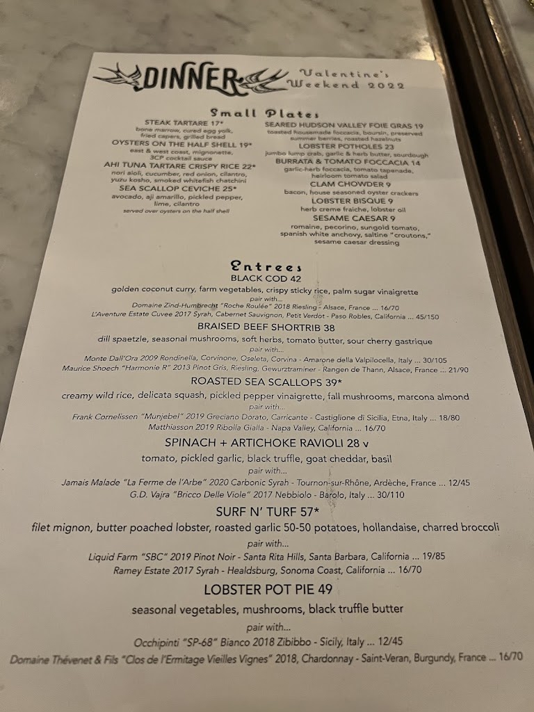 Outstanding menu! Highly recommend paying this restaurant a visit. It's not big, but the ambiance is nice. That said we entertained a group of 14, so groups are doable. The food is the star for sure. Highly recommend the lobster pot pie. Great service, especially handling our bigger group. Chloe and the team were on point.