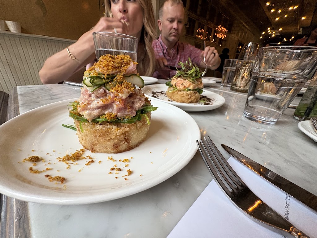Alex was very attentive and he was knowledgeable about the menu items. The atmosphere was nice with the front window open and sitting and watching as people walked by. The steak tartar was delicious with the potato chip topping but a little too salty. The scallops were delicious along with the duck tacos. They were spicy and had a fantastic flavor. We ended with the key lime pie which was also good and just the right amount of dessert. The old fashion was surprisingly good with the aged rum and the other bourbon drink I had was also very delicious.