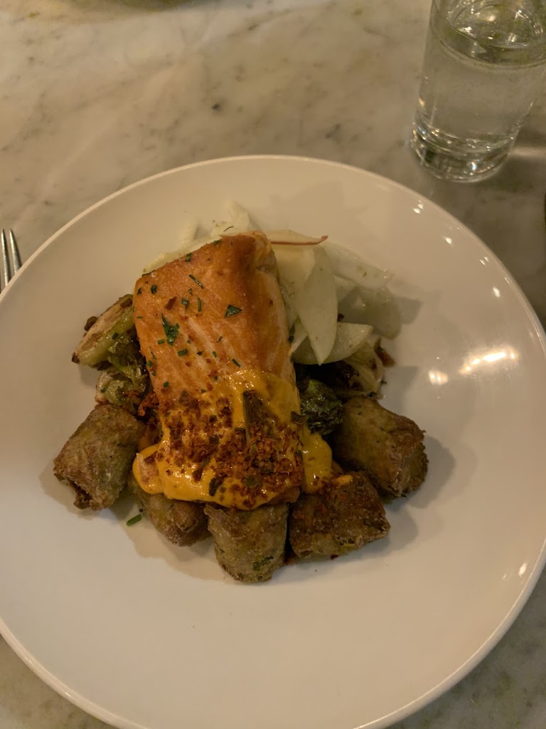As an entree, I ordered the salmon dish. It was definitely fresh and cooked perfectly. The sides were Brussels sprouts and homemade tater tots that were both just okay.