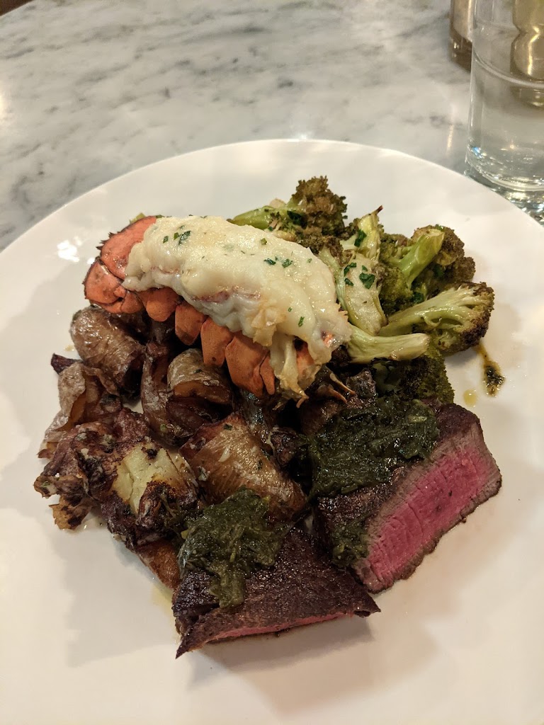 For the surf 'n turf, I loved the sides of potato and broccoli. However, it is never a good thing when you are wishing you just got potatoes and broccoli instead of lobster and steak! My steak was cooked well, but had little flavor. On top of the steak was a hollandaise sauce which tasted like nothing and seemed to have broken. I saved the lobster for last, so excited to finish with it, but my lobster was rubbery and had basically no flavor. I don't know if they ran out of seasoning while we were there, but that is what it seemed like!