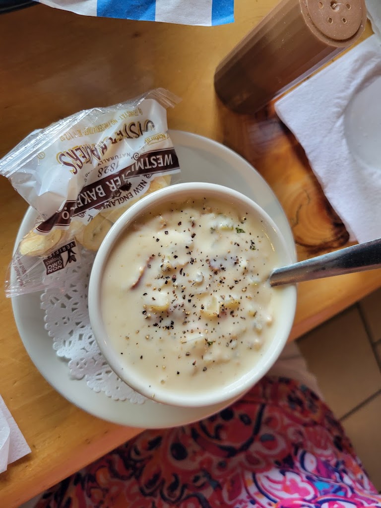Awesome service. Very friendly and accommodating. Super smiley! The Angus Burger was bomb. Clam Chowder most definitely crushed!!!!! Killer seating. Fun games. Very kid friendly.