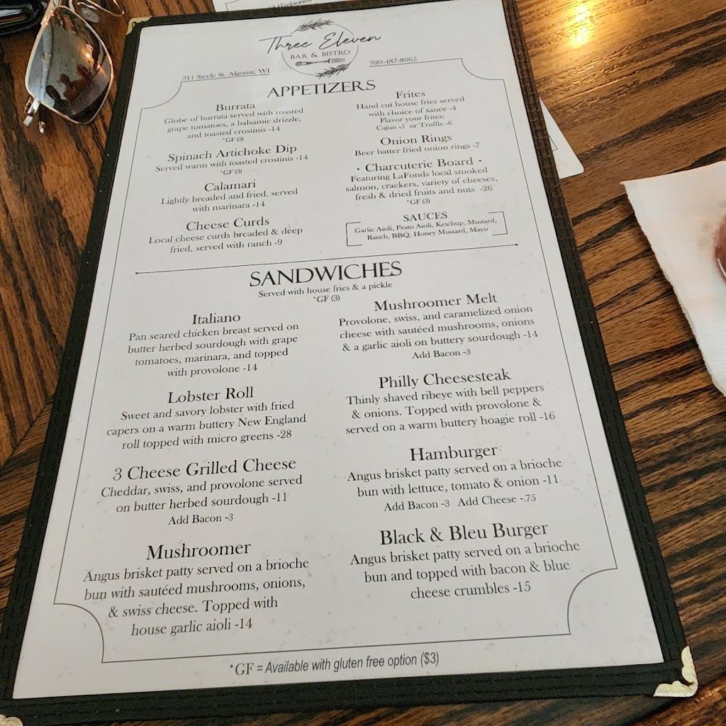I adore this charming bar and restaurant. The atmosphere is a cozy old fashioned oasis. It is extremely clean with white linen tablecloths, yet this IS Wisconsin so no dress code. The staff is professional, kind, and personable. They have a tempting cocktail menu, but I always get the decadant espresso martini. I had the lobster roll. It was delicious. I will order it again and again. When in Algoma, pick 311. You will not be disappointed.