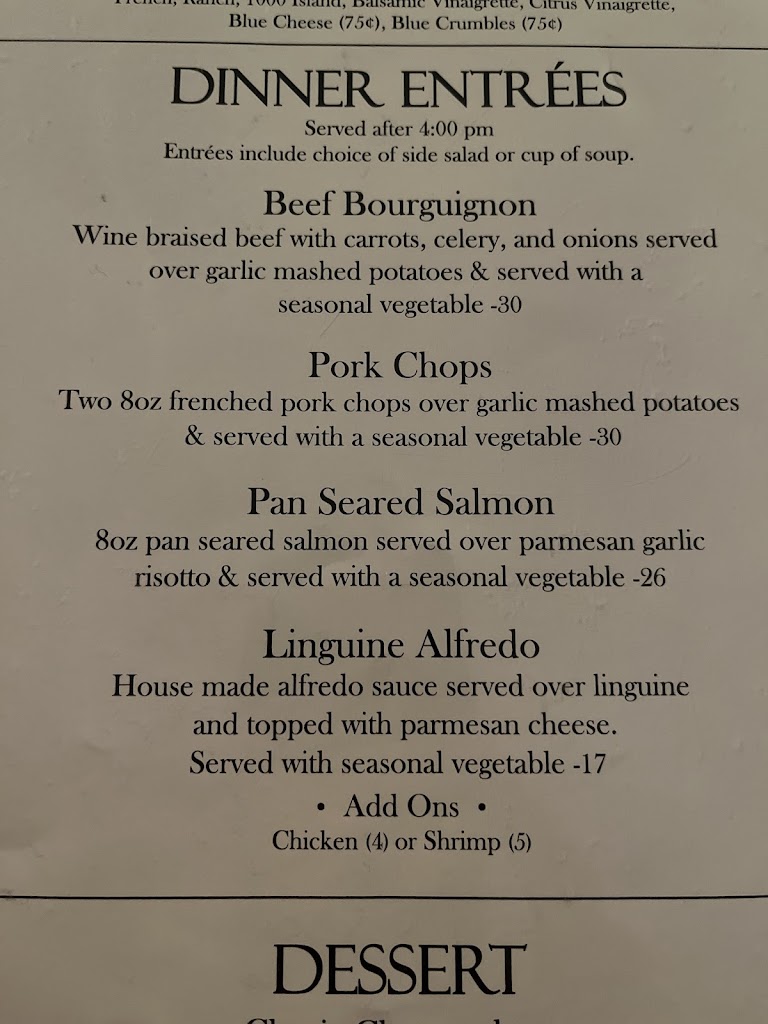 I’ve been in town for work and have stopped twice for dinner. I had the flat iron steak special the first time. Last night I tried the lamb chops special. The quality of food is great, the service is great, and they make the BEST Tom Collins from scratch!!!