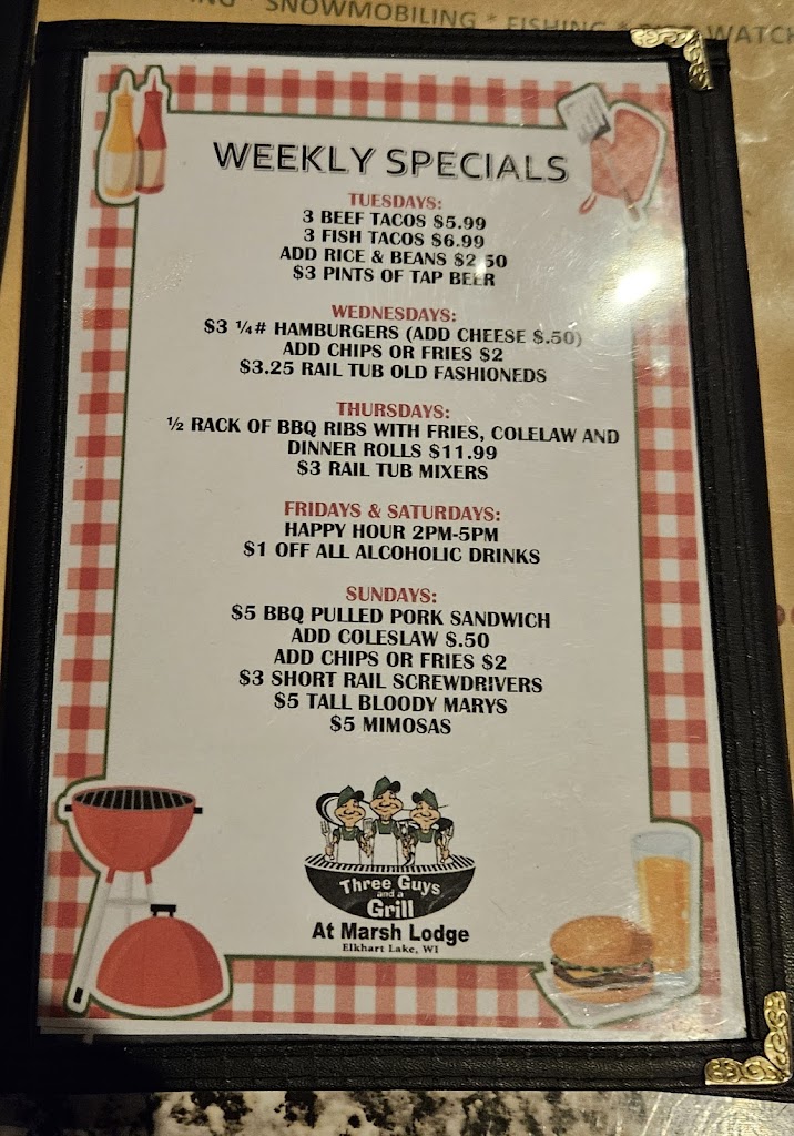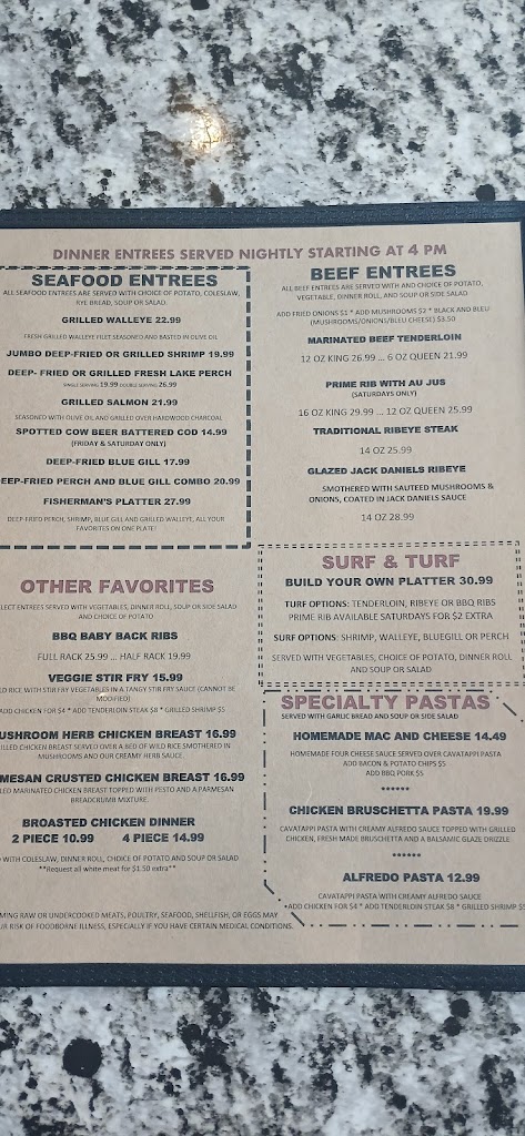First off the restaurant is in a beautiful siding by Elkhart lake and the Sheboygan Marsh so there's plenty to do climb the tower or go fishing or even camping but the food is phenomenal I eat the prime rib which is excellent every time and my daughter has ribs and we've never had a bad night yet out there I would highly recommend at least taking the drive out there it's a beautiful area and then the food just tops it off