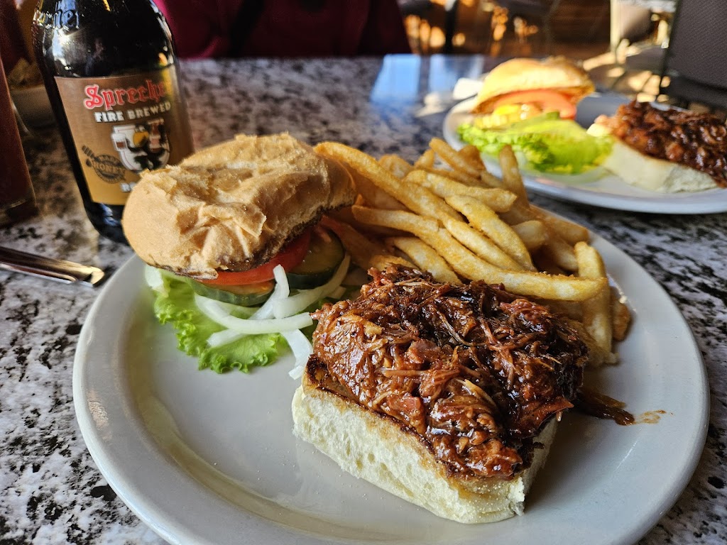 We enjoyed the food, Reuben, a pulled pork special, and a cheeseburger bowl, all awesome! Our server was fine, and the atmosphere rating was how warm it was inside, and the floors needed cleaning. It was like walking on ice, and it was an experience everyone, guests, and employees dealt with.