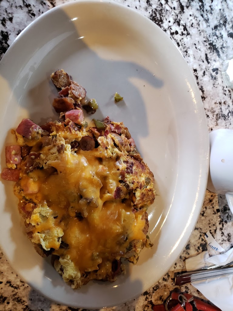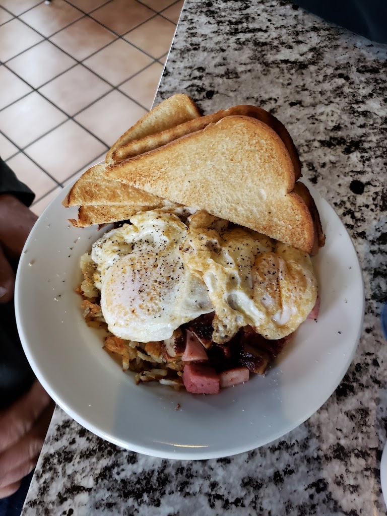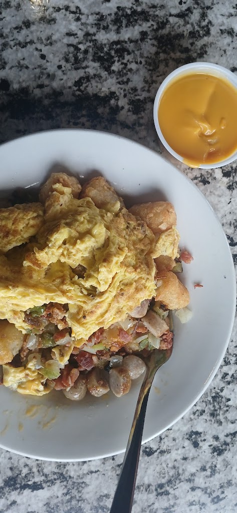 First time going here, to get breakfast. They didn’t have very many customers. Waited about 10 minutes to get our drink order, then placed food orders. I got the meat lovers skillet eggs over easy and fiancee got the tator tot scramble. Food took forever to come out, then when it did waitress brought it to the wrong table then instead of bringing it right to us, it went back to the kitchen. A few minutes later it comes out, one of my eggs was whites runny other one was hard and hash browns were barely warm. Fiancée’s was burnt scrambled eggs with some tater tots under cooked and everything just smothered in nacho cheese. I would have complained but didn’t have time to wait around another 30 minutes. Went to the restroom and it was filthy. Definitely won’t ever be back!