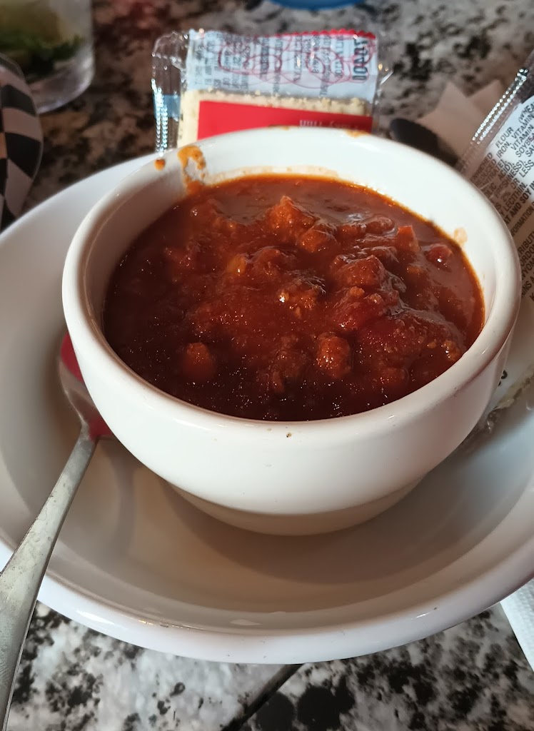 I ordered a Mojito to drink, nice lime and mint, very refreshing. For dinner I had onion rings. A huge plate, golden brown fried deliciousness. And the best part of the meal for me was the chili. Not too spicy and a great smoky flavor. I usually order chilli because it's easy for me to digest, and if I had known how damn good this chili was I would have ordered a bowl, not just a cup. It really was very very good.