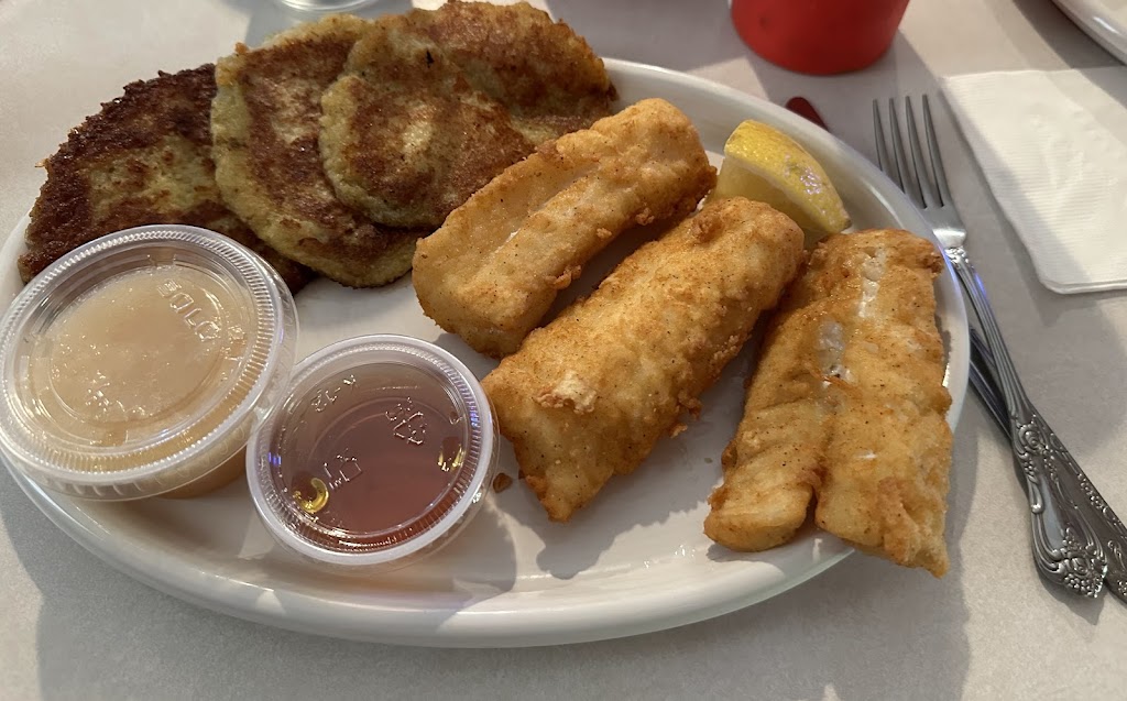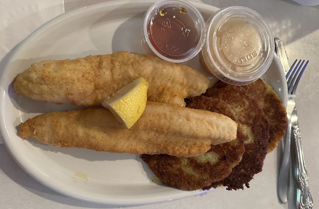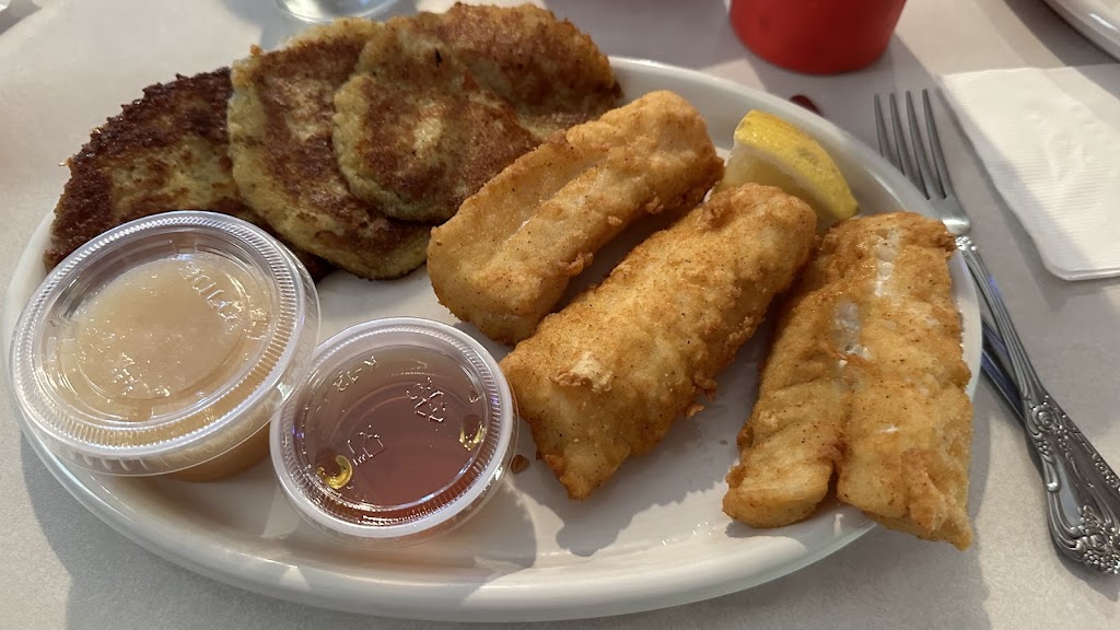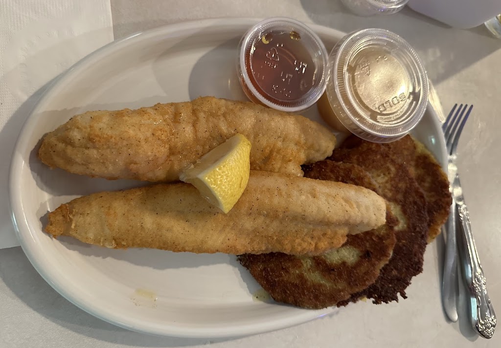The fish was not a heavy batter, which is always a plus. The applesauce was homemade. Amazing!! And the potato pancakes were a risky choice but these were the BEST potato pancakes weβve ever had. Ever!! So fresh, moist, yet crispy around the edges. Just a slight onion flavor - just perfect. And to top it off - REAL maple syrup, not the corn syrup based.