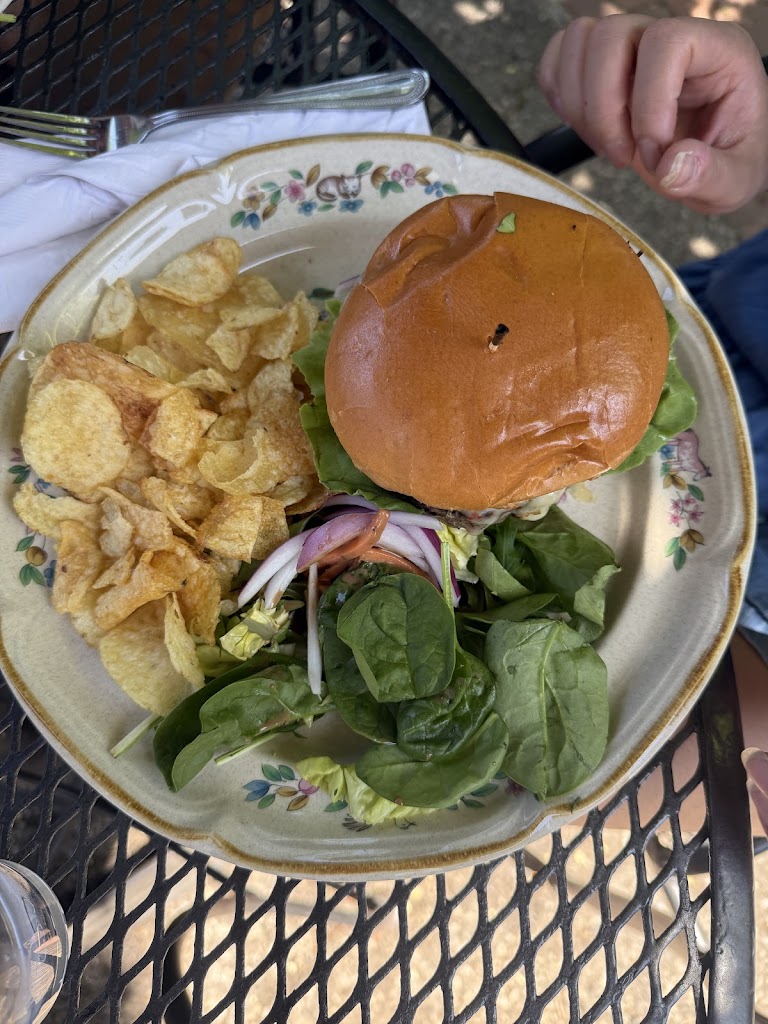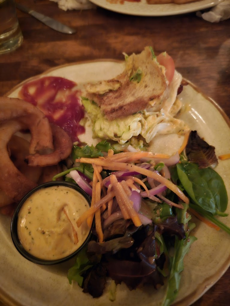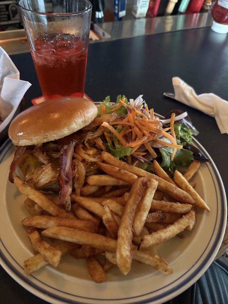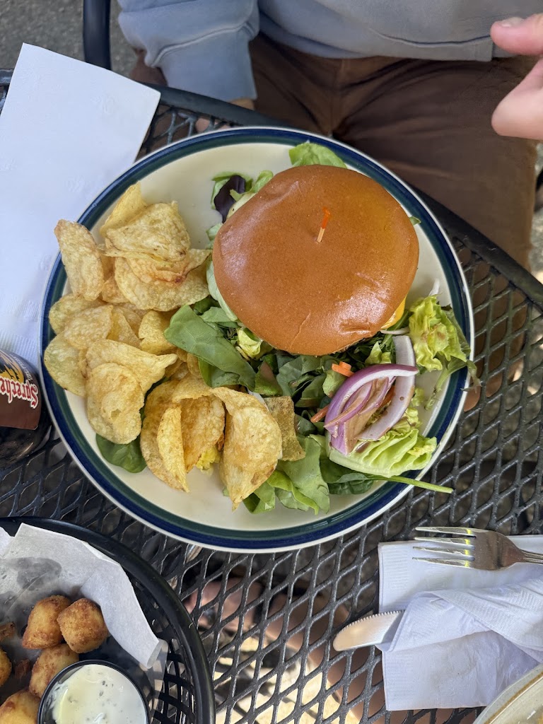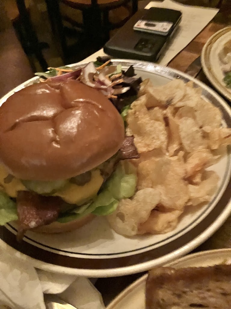Food was definitely good as it was comfort food. Daughter and I had hamburgers, which are served with chips and a robust side salad. I upgraded my chips to onion rings for 2.50. You could upgrade to fries for 1.