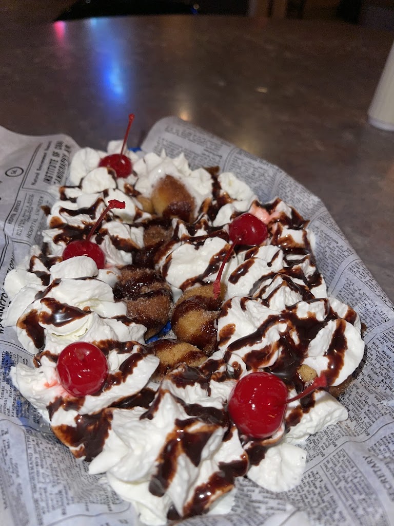 Clean and fun environment. The only place around to get food LATE. Reasonable drink prices. Excellent staff :)