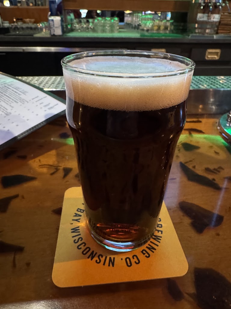 I tried the maple bacon red ale which was delicious. I also tried some of their craft sodas: strawberry rhubarb and cream. They were amazing. I also shared a reuben with my husband, which was really good. Bartender gave us great service. I will definitely visit again, the next time I am in Green Bay.