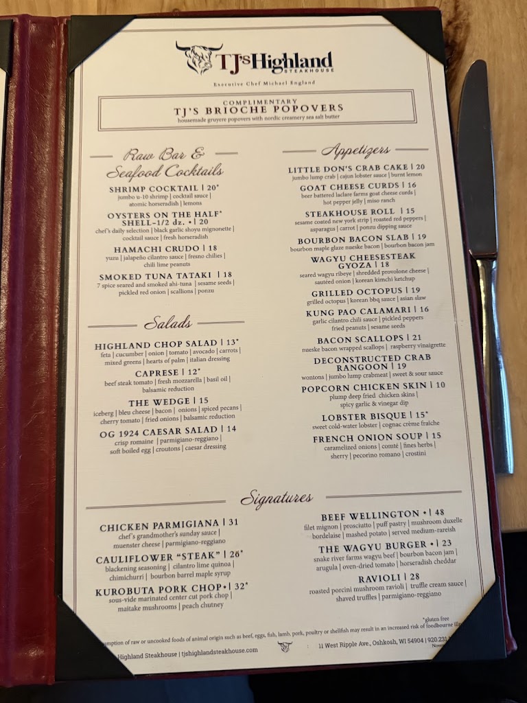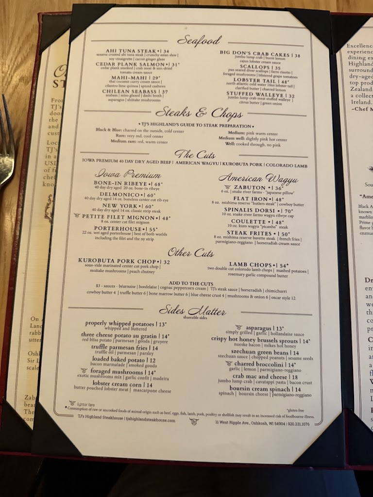 Good food but insanely overpriced. Had the $60 20oz Ribeye, the steak was good but I've had better at other local restaurants. For less than half the price you can get a steak that is equally as good at The Roxy in Oshkosh. The best part of TJ's was the atmosphere. Service was mediocre.