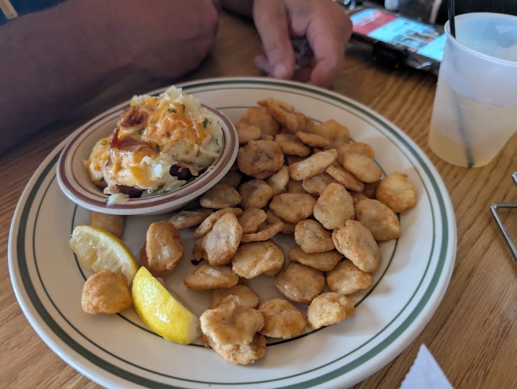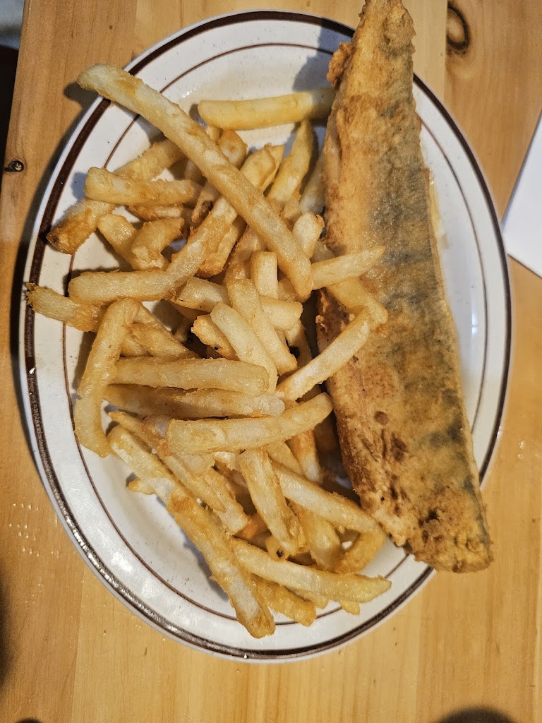 My girlfriend & I both liked the batter fried cod & french fries. Salad bar was very good with lots of varieties & soup. Bartender & waitress were both friendly & good. First time stop. Definitely go back.