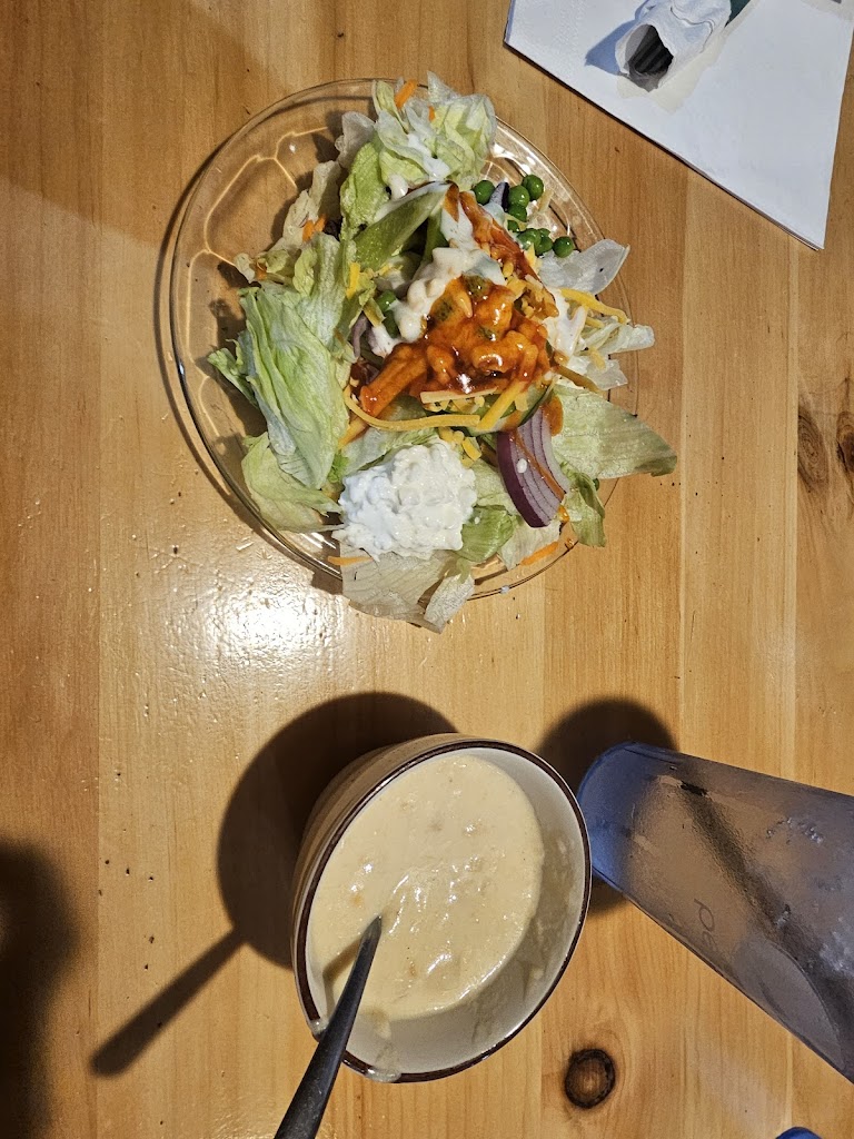 The salad bar had lots of selections. The cole slaw was really good. I also had bleu cheese dressing on my lettuce salad that was pretty good. There were also two soups-tomato bisque & clay chowder. I had the tomato bisque & that was really good. My daughter had clam chowder & enjoyed that.