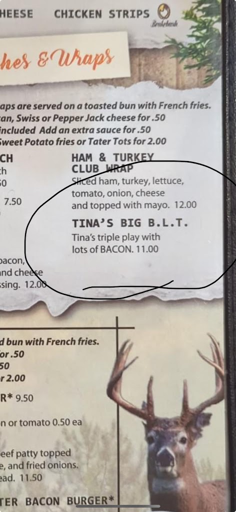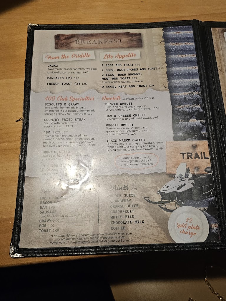 Good food, great atmosphere. Fun, friendly and sassy waitress. Really great service here. Would recommend. They are friendly to those riding the ATV trails.
