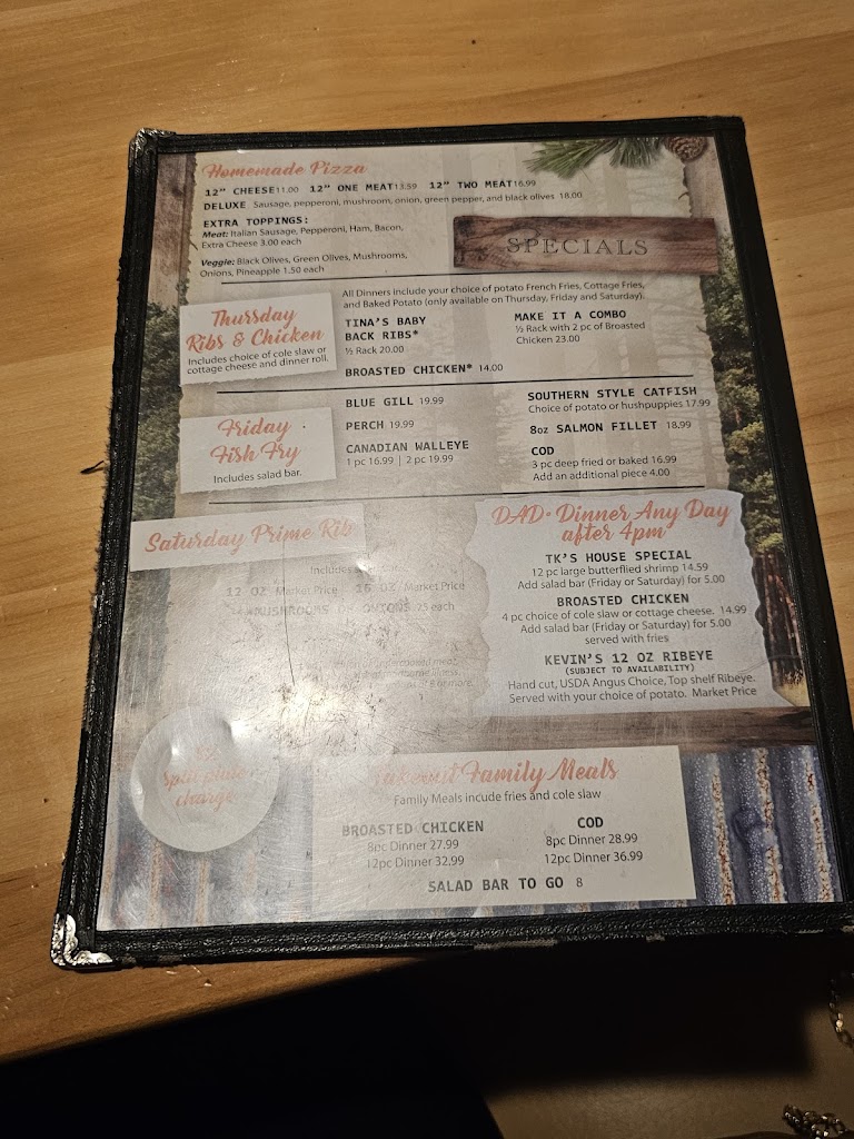 Stopped for a late dinner and glad to have showed up on 'Fish Friday'! I had 1 piece of walleye and that was plenty! Soup and salad bar was a lovely option. The fries were good. Added to the list if we pass through again. Good place to stop tp stretch the legs if you're on a road trip or an adventure! Staff was great!