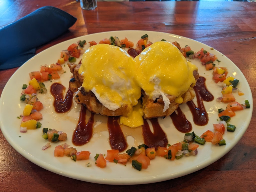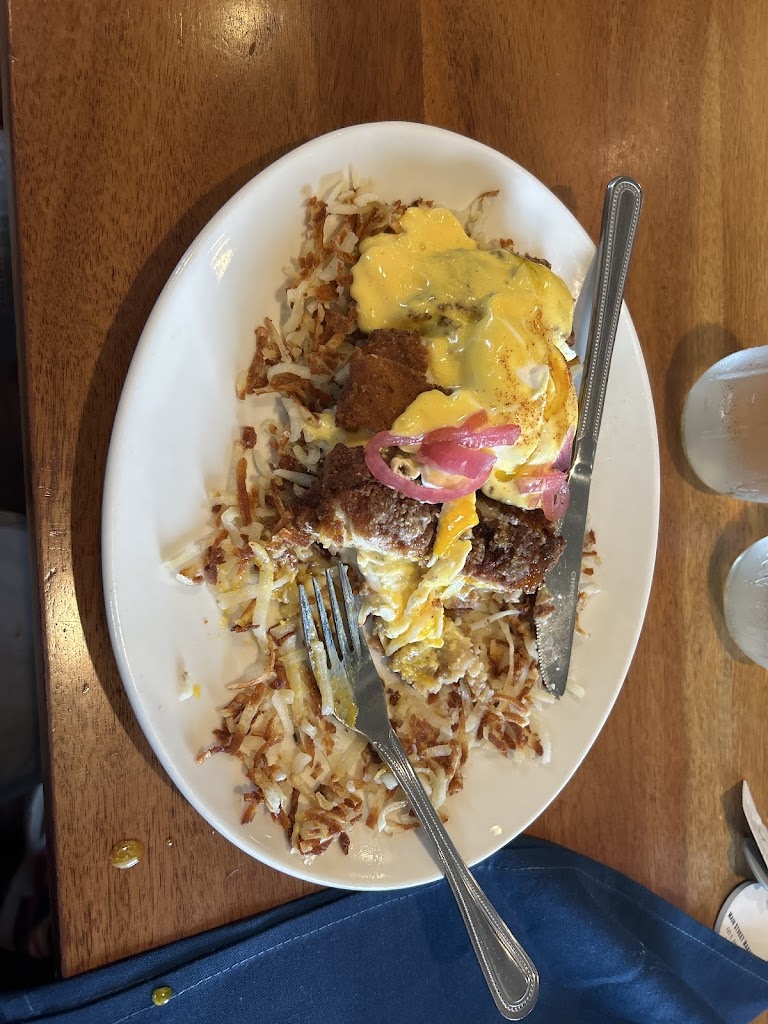 Really great Nashville hot chicken mixed with eggs Benedict. 10/10 recommend