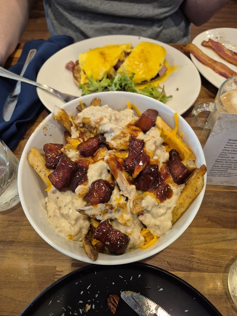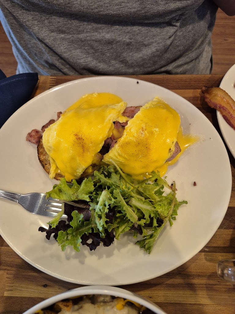 Benedict hollandaise was bland. Pulled ham had a few fatty chewy pieces. Egg was overcooked.