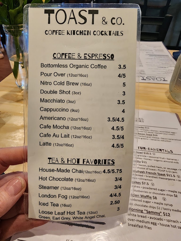 I have been to Toast & Co. a couple times now for breakfast, and I have always been very pleased with the fresh ingredients, friendly service, and GREAT coffee. I was on my way to work and craving one of their lattes. I wasn't sure if they did coffee to go since this is very much a sit down restaurant. I was beyond happy when I called ahead and they happily accommodated. It made my gloomy Tuesday morning a little bit brighter!