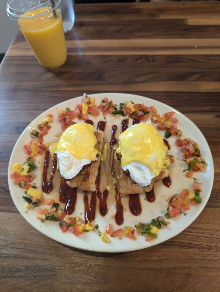 Dined in with a friend and we got the basic screwdriver to start, for $5 it comes in a ball mason jar glass and was great! For food, I got the traditional Benedict and it was amazing…. I also got the fruit cup and the fruit was so fresh! It came with cut strawberries, whole raspberries, whole grapes, and whole blueberries. Again, it was amazing!!! My friend got the basic Betty and also said her food was amazing, she asked for jam for her toast and the jam was also so fresh! Everything had so much flavor and we were pleasantly surprised!! We will definitely be back and will 10/10 recommend to everyone!
