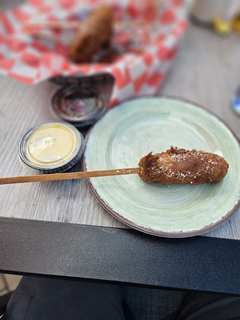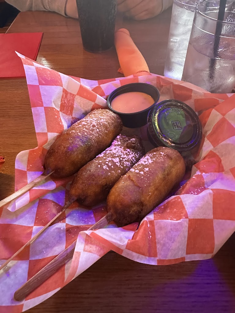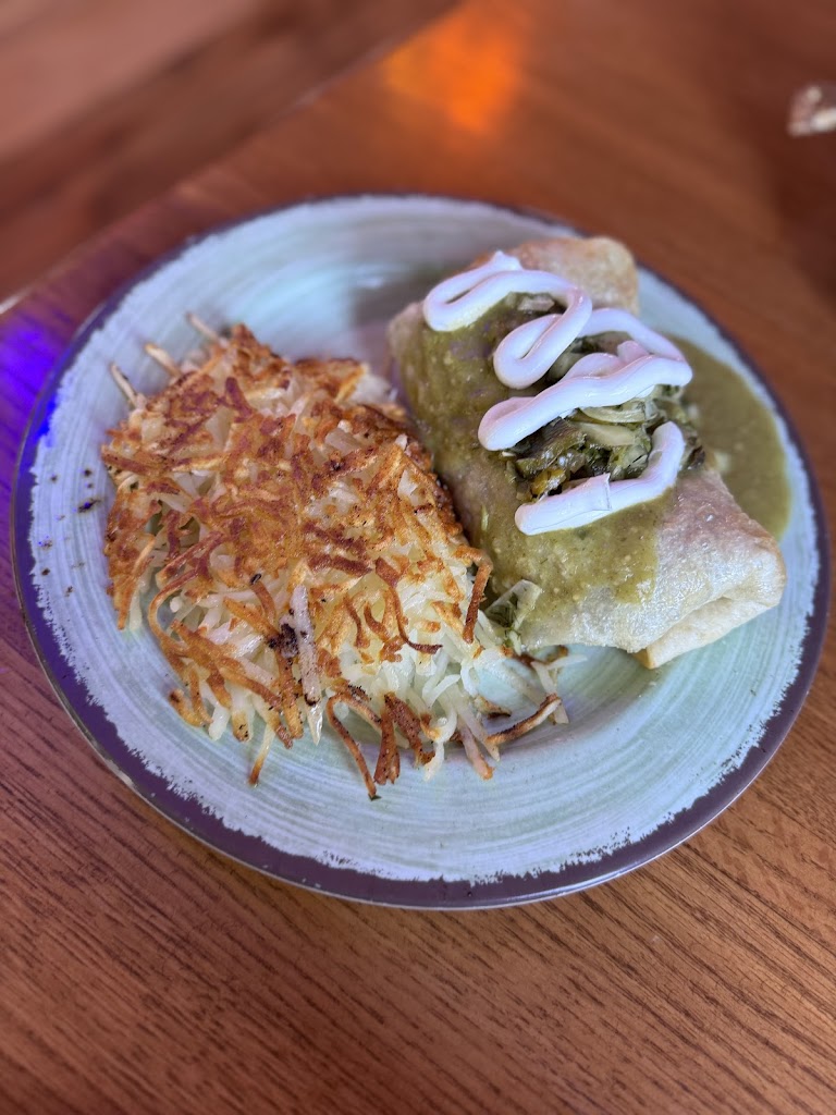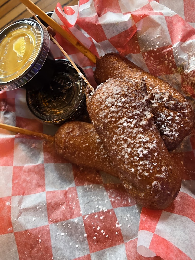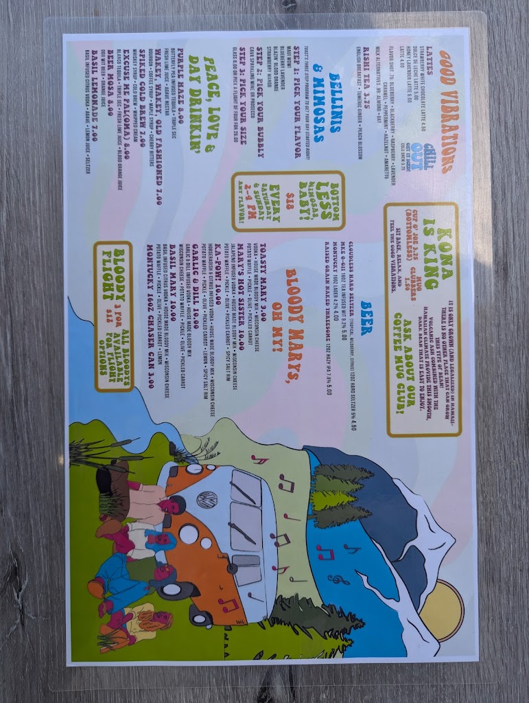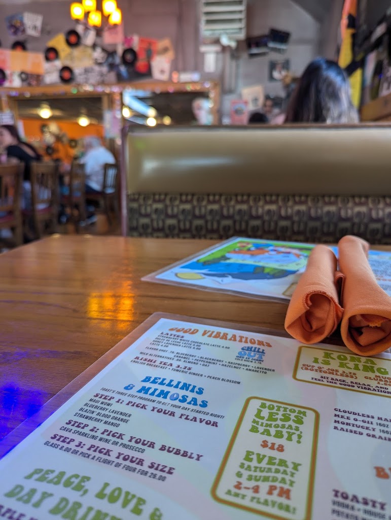 Food is fantastic!! First, the corn dogs batter is perfect, fits well with the chicken sausage. The jalapeño honey mustard is to die for, perfect flavor combo. I had the beef burrito, wife had the beef skillet...beef was perfect in flavor and texture. The drinks offered are also just right...Bloody Mary's and mimosas with great choices of flavors OR do the 4 sampler!! Environment is fantastic, 60's-70's music, hippie like, vinyl on the walls with the album covers, great music...This is my new go to, especially for brunch!