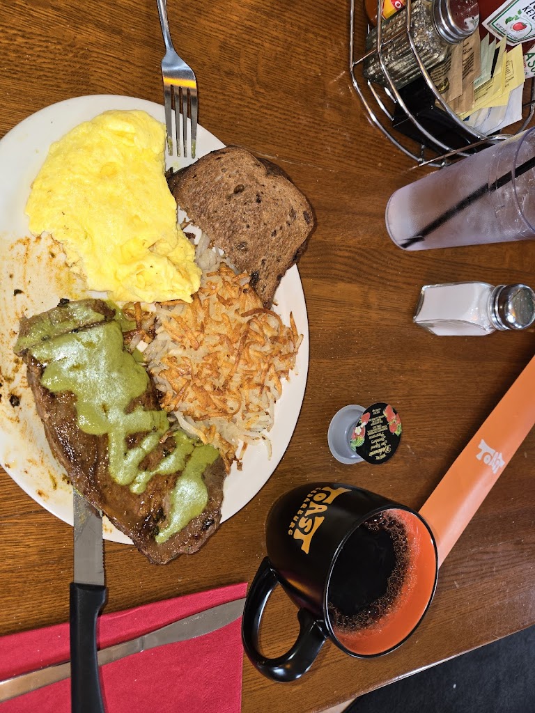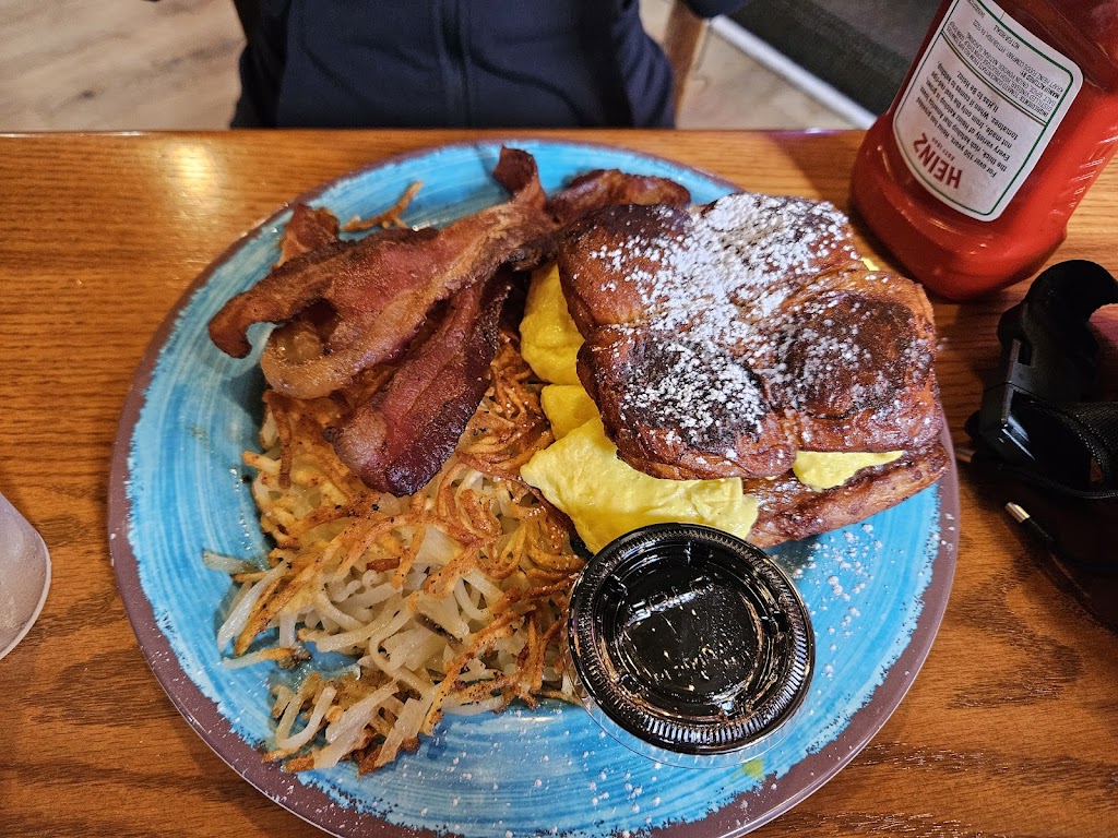 I really enjoyed this place for my first visit! The staff was very nice!! The food was .. omg so yummy lol. I had a steak skillet with French toast. The steak was literally perfect! Juicy and tender. Lacked a bit of flavor but nothing some salt and pepper couldn’t fix. The French toast was fluffy and pleasant. I had a cucumber drink that was so delicious and it got me tipsy right away!! lol. Overall, it was a nice experience. I only gave it 4 starts because my stomach has been very upset since I left. I am doing this review 24 hours later and my stomach is still messed up. So there may have been some cross contamination going on .. but other than that, I would visit again. Just hope it doesn’t end in a stomach ache!