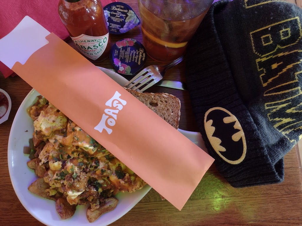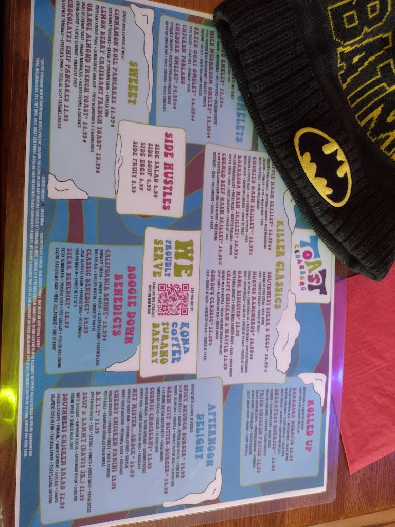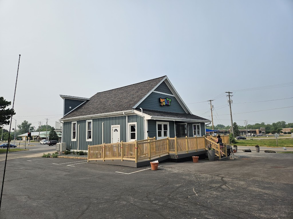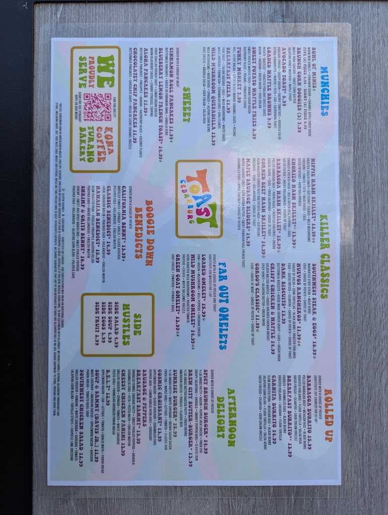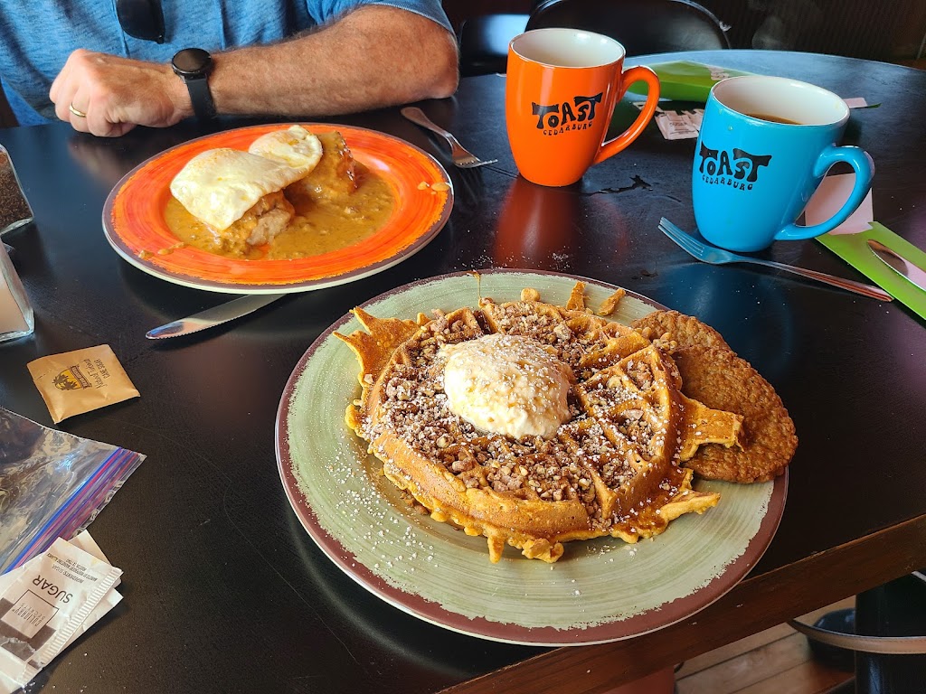 Took my mom here for breakfast on a Monday. Was after 9 am so morning rush was over. Seated immediately and our waitress greeted us. Cool place, fun vibes!! A latte for myself, iced and just water for mom. I ordered the cinnamon roll pancakes with bacon and mom had a skillet of some sort. We didn't wait but maybe 15 minutes or so and our cheery waitress brought out our food. My pancakes were awesome!!! So yummy, although the little cup of syrup they first give you doesn't go very far, you'll be asking for more. Mom said her skillet was great and took some home as there was plenty. We'll definitely be back at some point for the lunch menu, which is a tough call as Toast is located right in front of Wayne's Drive In and you know how good their burgers are!!! I left our waitress a fifty dollar bill, I believe the 2 meals and my latte were roughly $38ish, plus tip. See ya next time!!