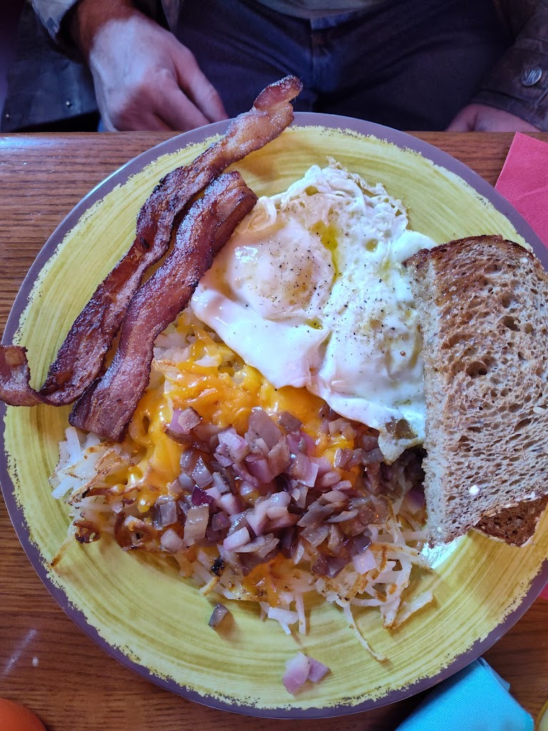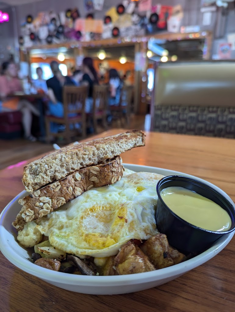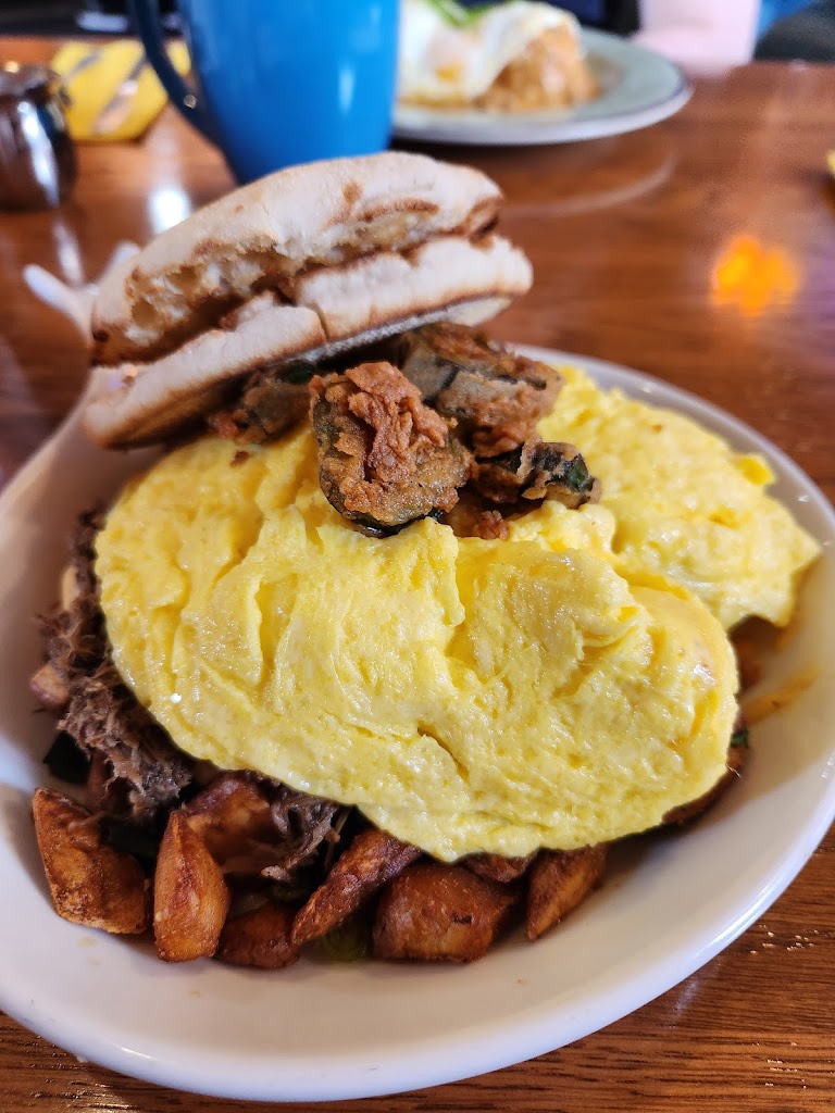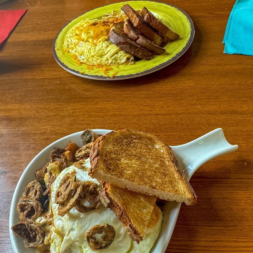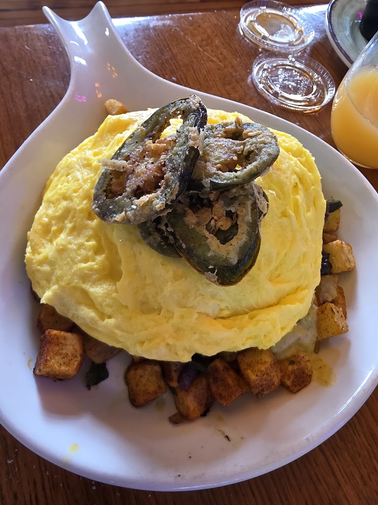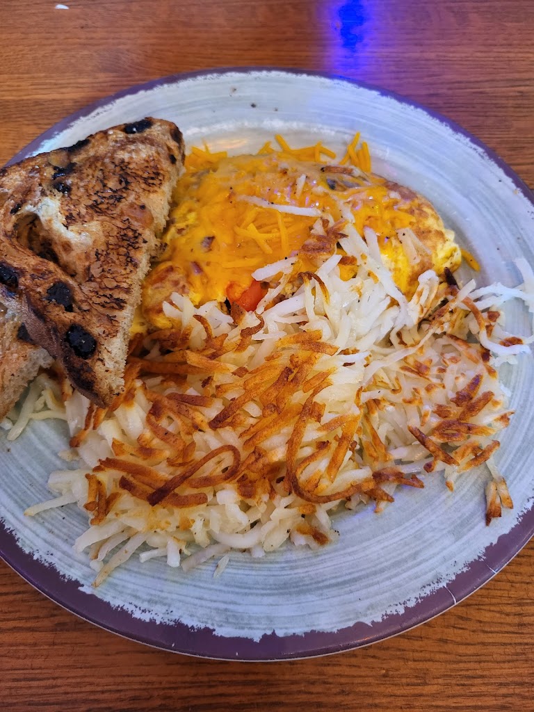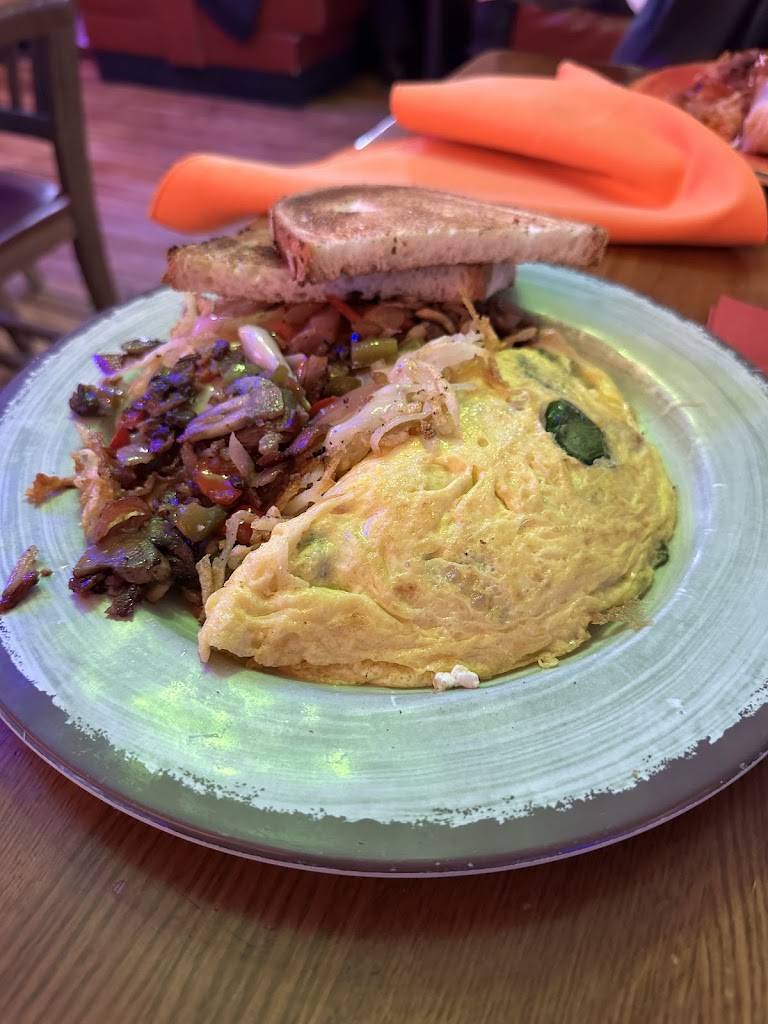 The service from our waitress was very good. She was definitely attentive. The atmosphere is eclectic & fun. Our omelettes were good but would definitely recommend the hash browns over the potatoes. We had 1 of each. SKIP THE SAUSAGE. The pork sausage had no flavor. If it’s homemade made someone forgot the spices.