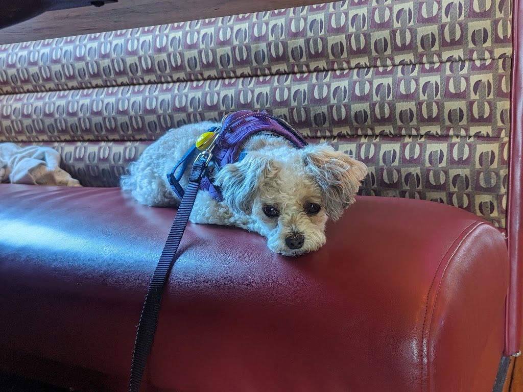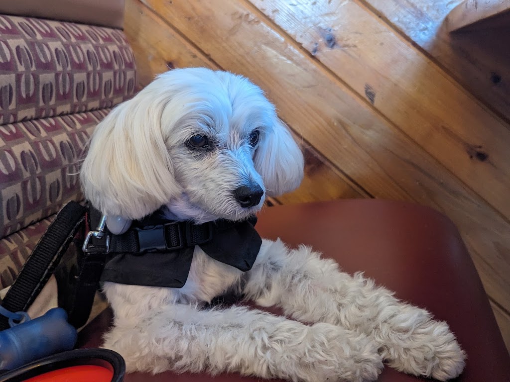 Anyways my wife got the thumbs up by the hostess, so we unloaded our two 15 pound dogs on leash. We got them seated at the table. We almost always order them a meal as well. They are spoiled.