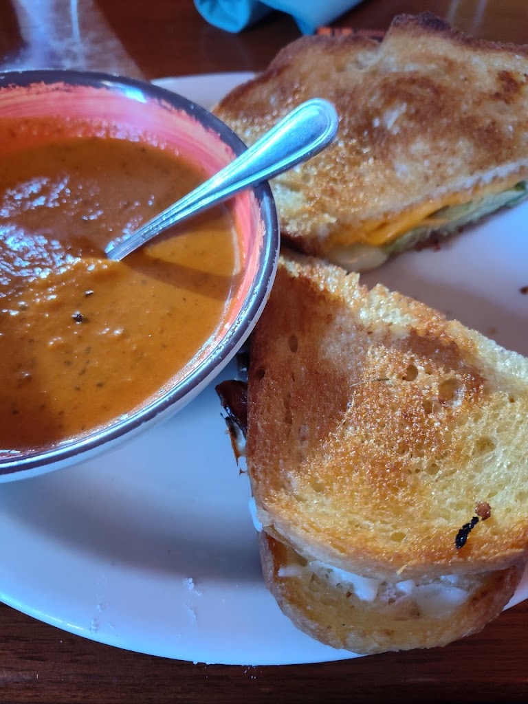 Service was excellent in all areas. It was a hot day, but a/c was not up to par where we were sitting. I was uncomfortably warm to the point of using my menu to fan myself. I understand a/c struggles when it's this hot, but it just added to not the best experience. This was our 2nd time visiting, so we tried new items from the menu. I ordered the cheesy chicken panini which was not a panini at all. It was a small piece of grilled chicken with a few leaves of spinach, a slice of tomato, some cheese (not much to fit the name " cheesy", and an aoili of some sort on very large grilled sourdough bread. Plenty of bread to spare when I was finished with the "purpose" of the sandwich. Our server was great, but was unfamiliar with panini bread when I brought the issue to her attention. She did say she would share the feedback with the cooks. For the record, "panini" is in the name of this menu item, and the description of the item specifies panini bread. I would not have chosen this item if I knew it was on grilled sourdough.