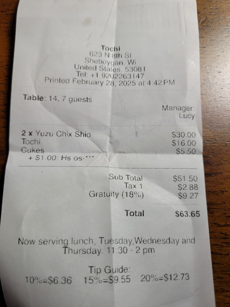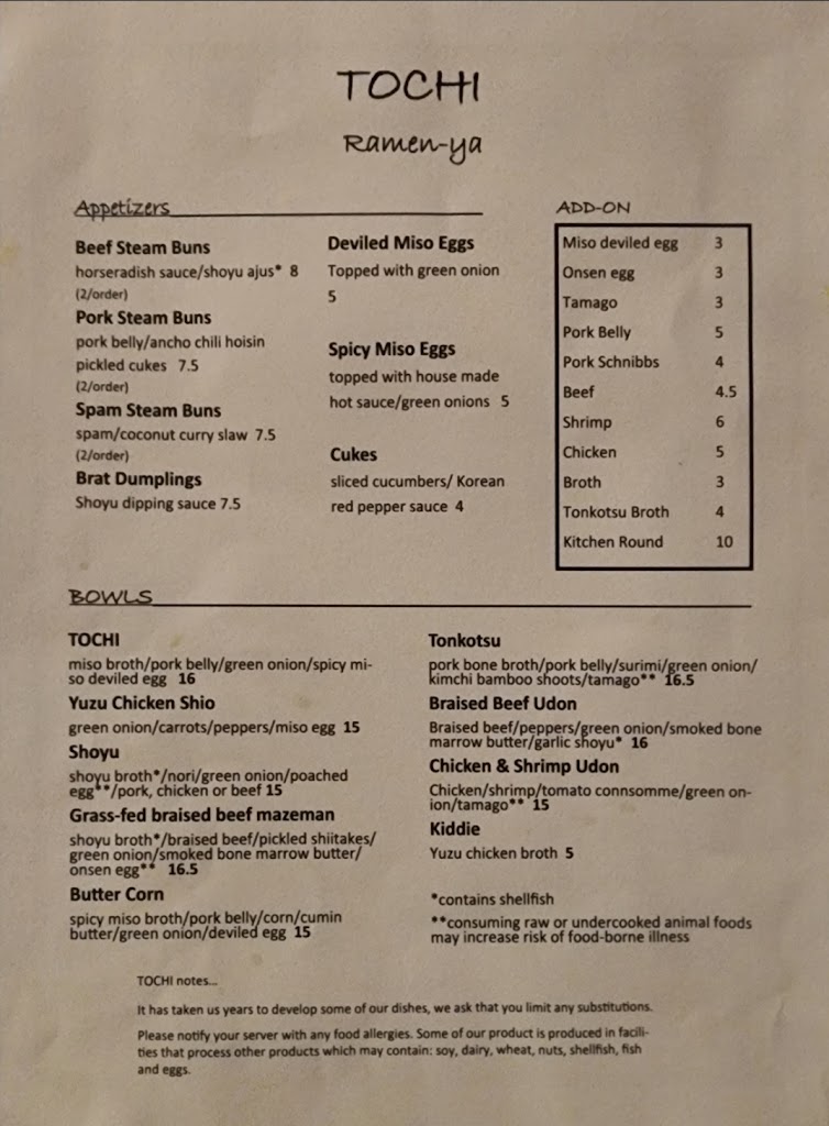 I don't leave reviews. But today I feel compelled to leave one. I am so disappointed. As most of anyone who follows or has known Tochi Ramen they came from west bend wi. They relocated to Sheboygan. As any one should expect, when locations change, so do other things. I understand and don't argue that at all for the record. But as some one who have Loved Tochi from Day one, this is now my last!