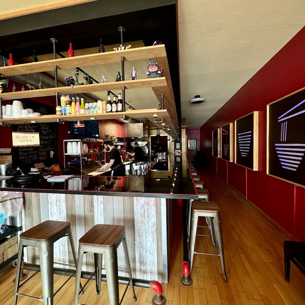 Excellent ramen with an American twist! Delicious apatizers and a selection of great drinks. They always play godzilla films or retro anime on the television. They have tables for reservation only, otherwise you sit at the bar in a first come first served manner. Wonderful place to dine!
