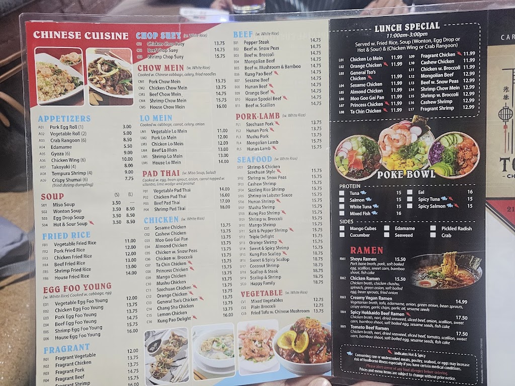 We have eaten tokyo fusion three times now (twice carry out and once in the restaurant) and the food and service were phenomenal every time! We have tried 3 different sushi rolls, two different Chinese chicken dishes, and the vegan ramen and we were happy dancing with each bite :) we also tried the crab rangoons and the gyoza appetizers and those were fantastic as well! Definitely recommend trying it out!