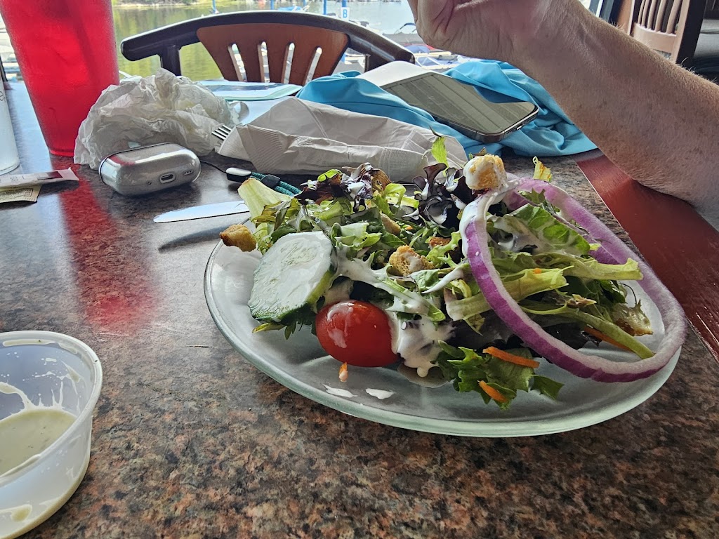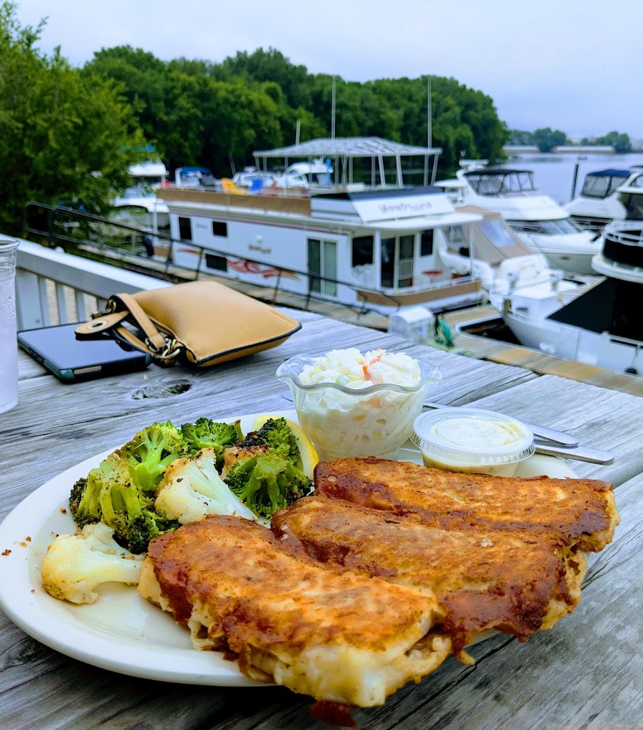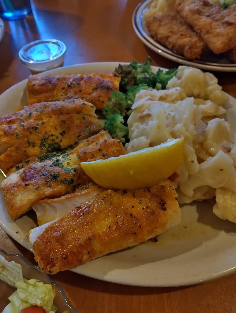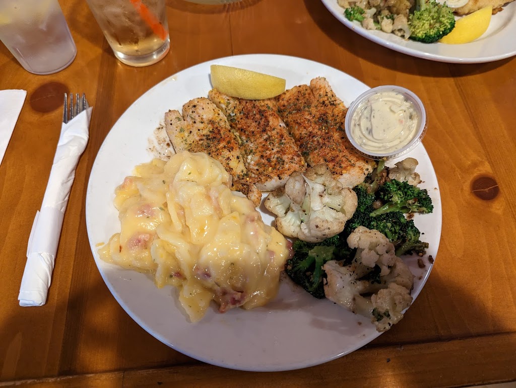 Probably the best scalloped potatoes in the area and the pan fried haddock was perfect. Broccoli was excellent and perfectly seasoned . All at $14 for a 3 piece dinner. The other 3 in my group were also very pleased with their entrees. Great service and a nice location on the water with plenty of eagles and other birds flying past. Rustic but pleasant atmosphere with the owner stopping by to say hello as usual. Great value.