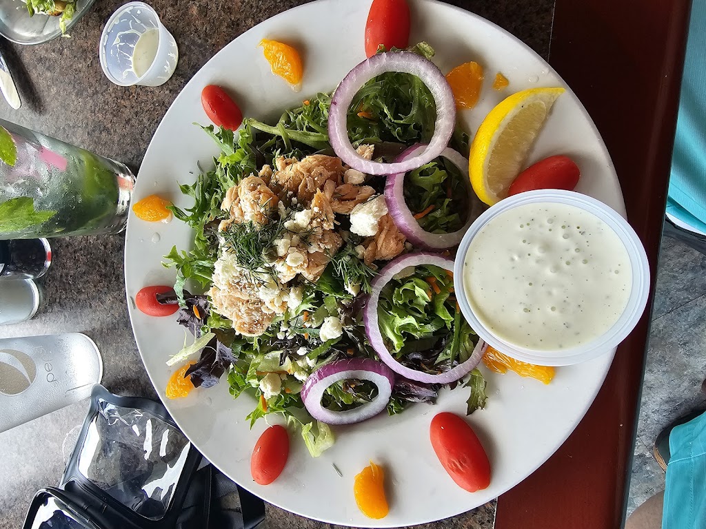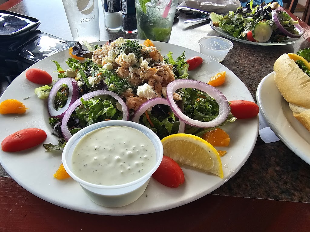 The food was great. My wife got the catfish poboy and I got the smoked salmon salad. Ranch was amazing. I got a mojito, which was excellent.