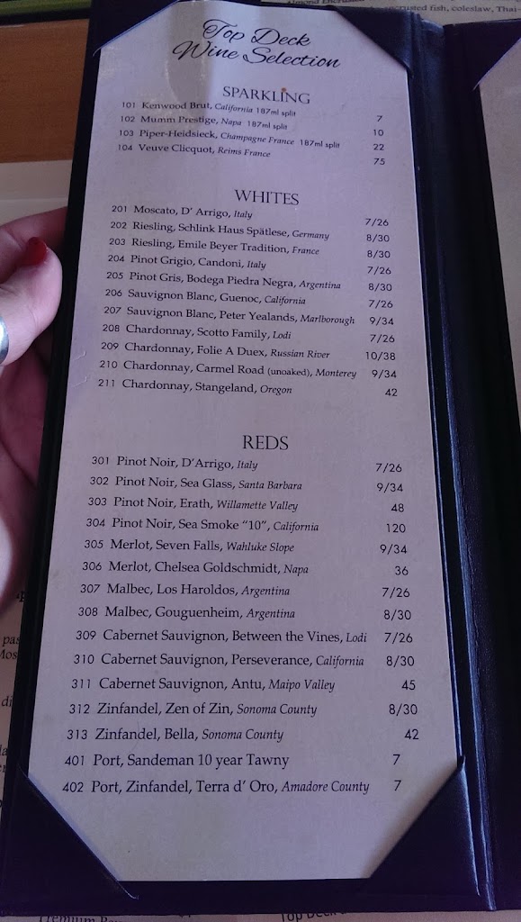 Great experience at Top Deck this evening. Fantastic staff and service. The food was amazing. We each tried a different dessert and they were each delicious! Key lime pie and crème brule were our favorites. Can’t beat the view, even on a rainy day.