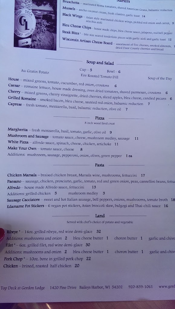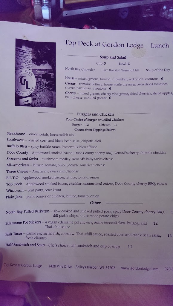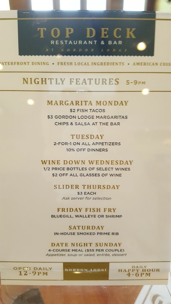 Top Deck at Gordon Lodge is such a beautiful place -- excellent food, service and atmosphere! Fish tacos on Mondays shouldn't be missed, they're the best I've ever eaten. Really creative apps and salads, delicious!! If you're visiting Door County, this is one place you need to see and experience for yourself. Spectacular sunsets on North Bay!!