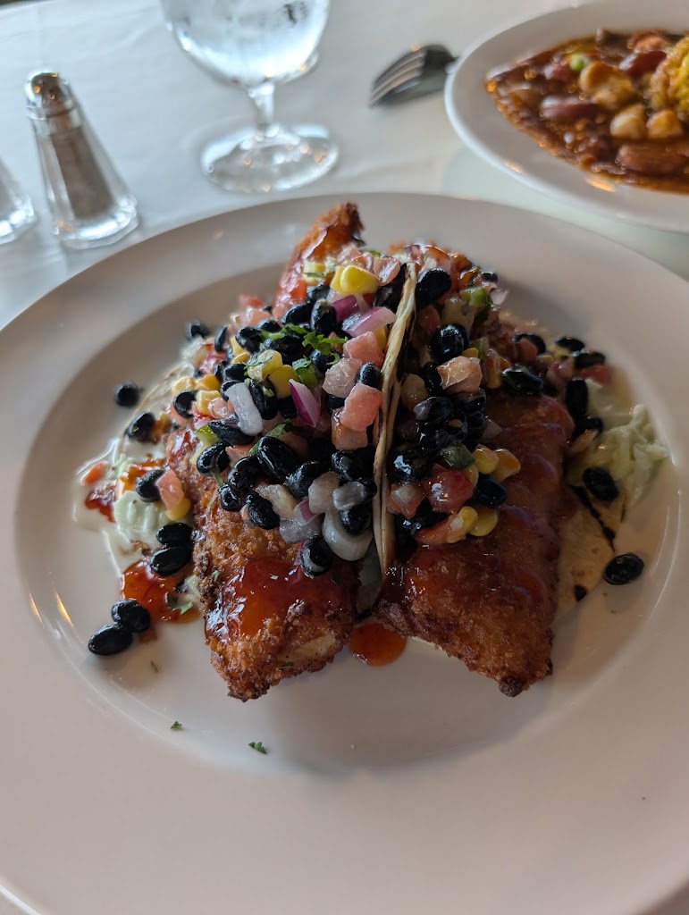 Absolutely fabulous food! Small dining room with a bar and windows overlooking the bay. The two of us shared the duck wontons as an appetizer, and they were absolutely fabulous ! My fish tacos were amazing and my husband enjoyed his jambalaya as well. We left very satisfied! Service was fairly quick and very attentive. We will definitely be visiting again on our next trip!
