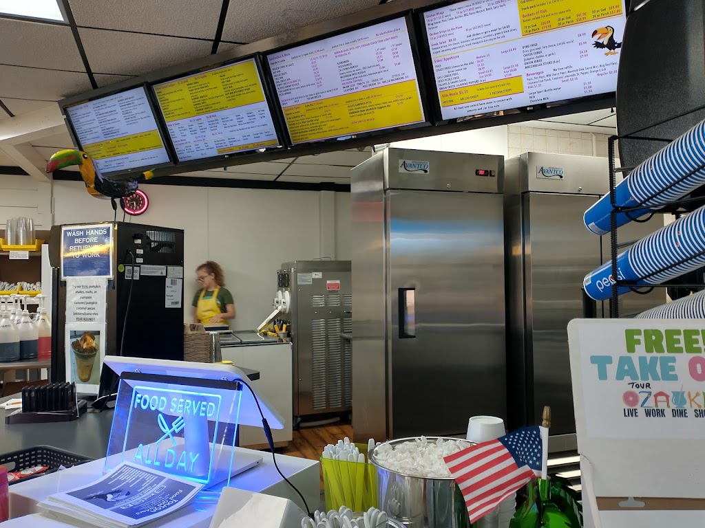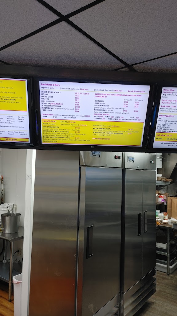 Family restaurant serving Leon’s custard, huge splits,concrete mixers, sundaes,cones,dishes,shakes/malts, floats, gyros and chicken shawarma off the cone, 100%ground chuck quarter pound burgers from Leroy meats of Horicon, crispy chicken wraps, falafel, baba ganoush, cheese fries, spicy pickle fries, cheese curds, so many more appetizers and food on menu. We have an awesome patio in back for outdoor dining with tv/music/fun atmosphere. Inside dining also available with 2 TVs inside, walk up window for those who do not want to come inside(pets welcome and pup cups also available) curbside pickup for those wanting to stay in their car. All orders made fresh no heat lamps. Call in your order ahead of time for pick ups; also door dash delivery.
