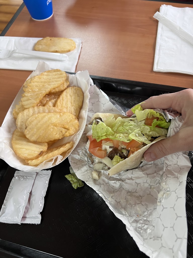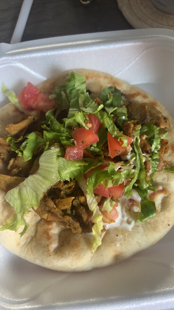 Chicken schwarma pita sandwich was excellent! So glad I stopped. They have a front and side patio where you can order from a walk-up window outside, or you can sit inside at a booth where it's air-conditioned. The patio has several seating options including a bench swing and metal tables w umbrellas. The staff was calm and kind.
