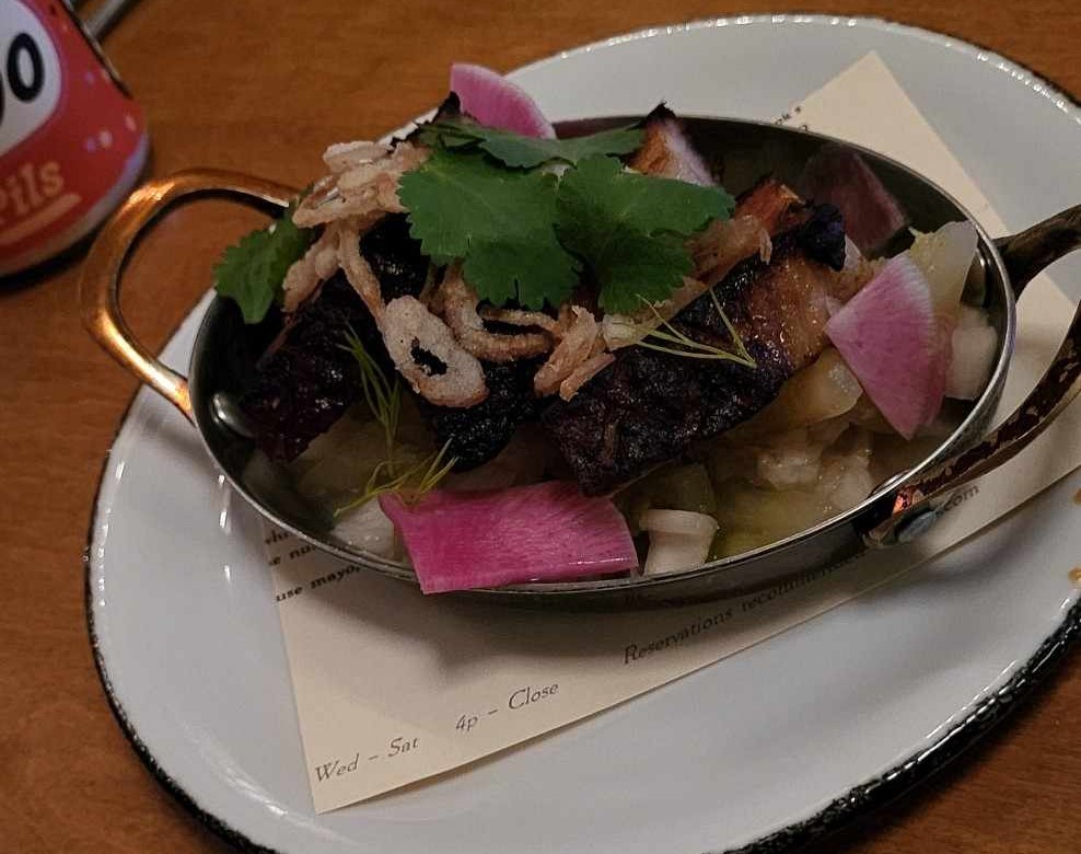 Stopped in for dinner on a Saturday night. The dining room is small and has limited seating. Dispite it being busy we were able to find a seat. We had the pork belly with kimchi hot starter. It was great, perfectly cooked and the kimchi had a great bite to it. I had the rib eye which was cooked perfectly medium rare and full of flavor. My 10 year old had the full baked trout and was in heaven. My wife had the pork shank and it was fall apart melt in your mouth delicious. The staff was amazing and attentive. I would recommend this establishment 100% top to bottom.