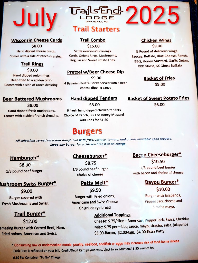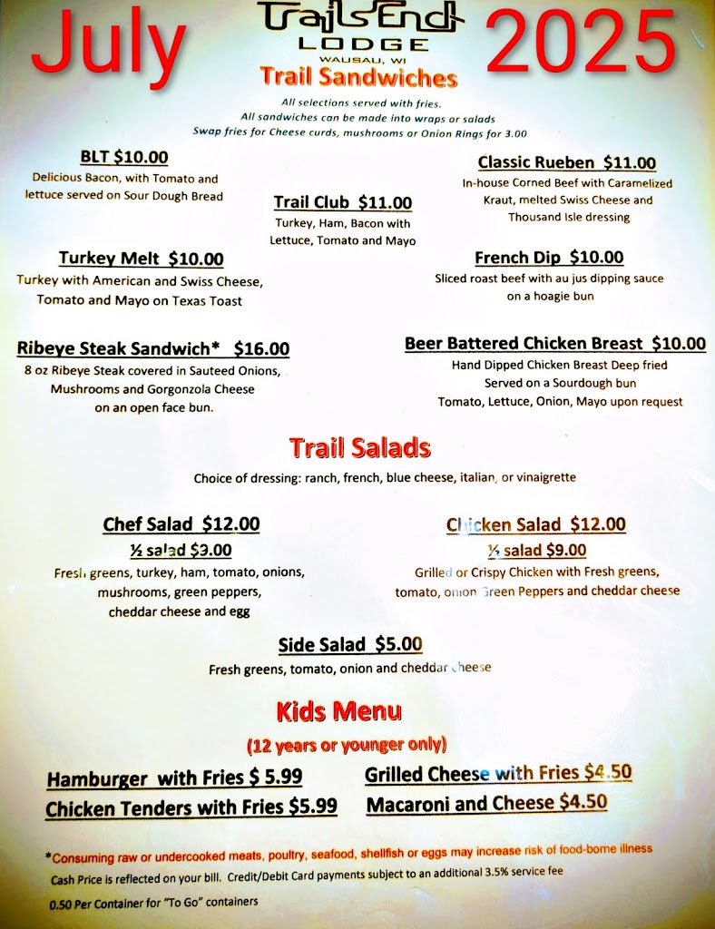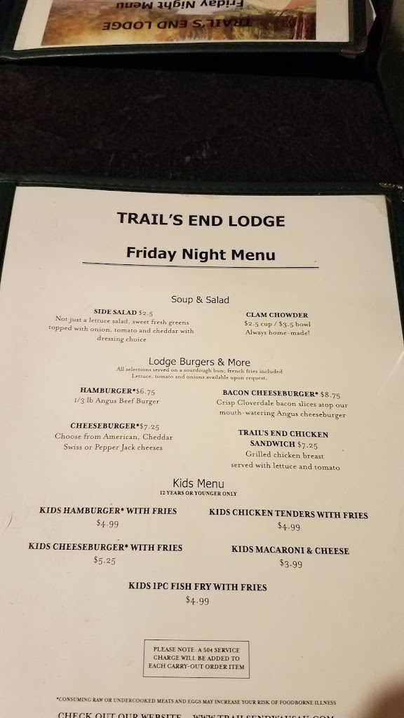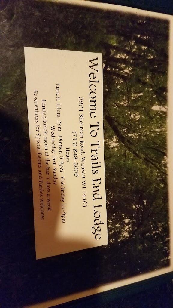 A great land and water casual gathering place. Friday fish fries rank with the best in the area. Yummy in house made chicken strips and cheese curds every day, other tasty food on the menu too! Lovely dining room to accommodate large groups. We love the owners and staff who truly care about their customers. Trails End Lodge is a happy place to spend time!