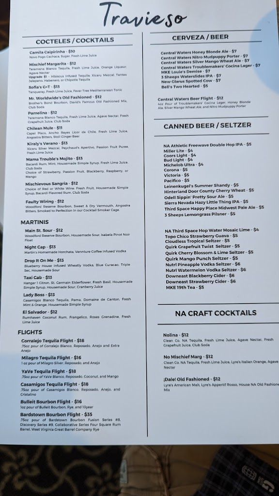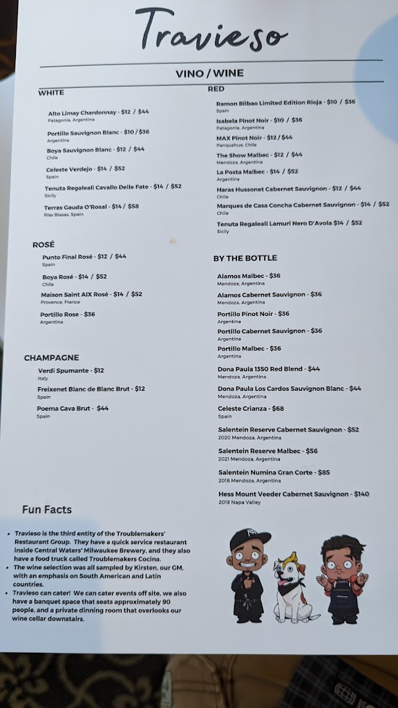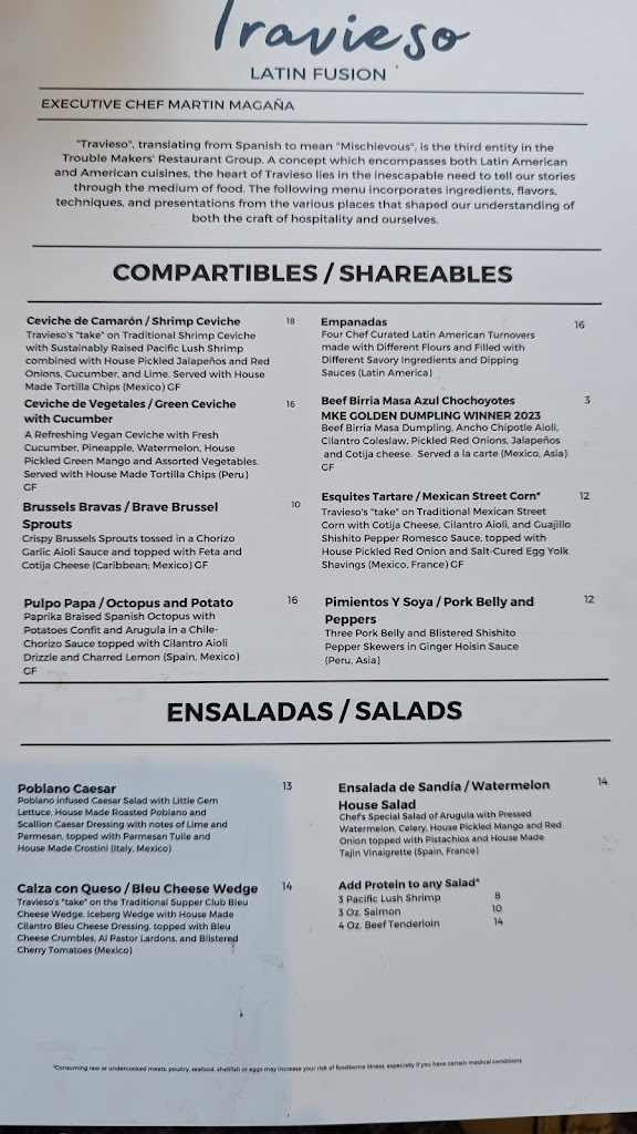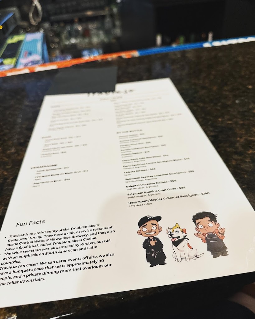 We met Martin, the chef and owner, when he won at Dumpling Fest. His dish was very good and fantastically interesting, and we were intrigued to learn he had just opened Travieso in Waukesha where we live. Our first dinner was tonight and we will be back. The menus, both food and drink, are very diverse, imaginative, and creative. Martin blends regions and styles in creative ways but without feeling forced or jarring. Can't say enough about it!