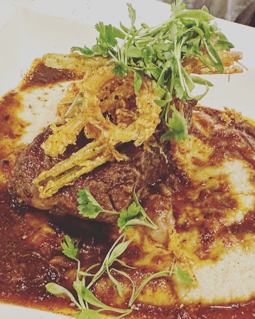 Bar service was great, server was great, place was cute. BUT I ordered the Butcher's cut of the day and was assured by the bartender that the butcher's cut features the steak itself and that there was no crust or sauce. This here is how it came out...I guess I should have asked the server how it was prepared before ordering. After being served I was told it was a red wine reduction of some sort but it was SO thick and heavy. I had them "clean it off" and re-sear it. The steak itself seemed of good quality so I'm unsure why they would mask it like that.
