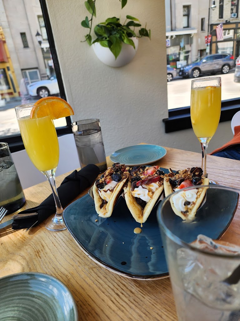 This restaurant seems to be a secret gem in Waukesha for Sunday brunch! We took my 91 year-old mom there for her birthday and the place never filled up. Where is everybody? Every single item we ordered on the menu was exquisitely prepared and delicious! Gourmet food for very reasonable prices. Our servers were delightful and attentive. Being at the five points in downtown Waukesha makes it also an historic experience with bright large windows looking out at buildings of yesteryear. Decor is lovely while retaining a casual, comfortable ambiance. We highly recommend this place for brunch and also have loved it for dinner!