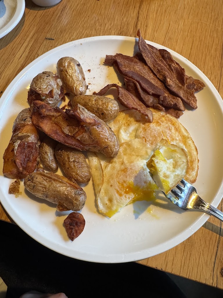 The waitstaff seemed overextended. Eggs and other breakfast items were great, except for the bacon - it tasted a little funky.