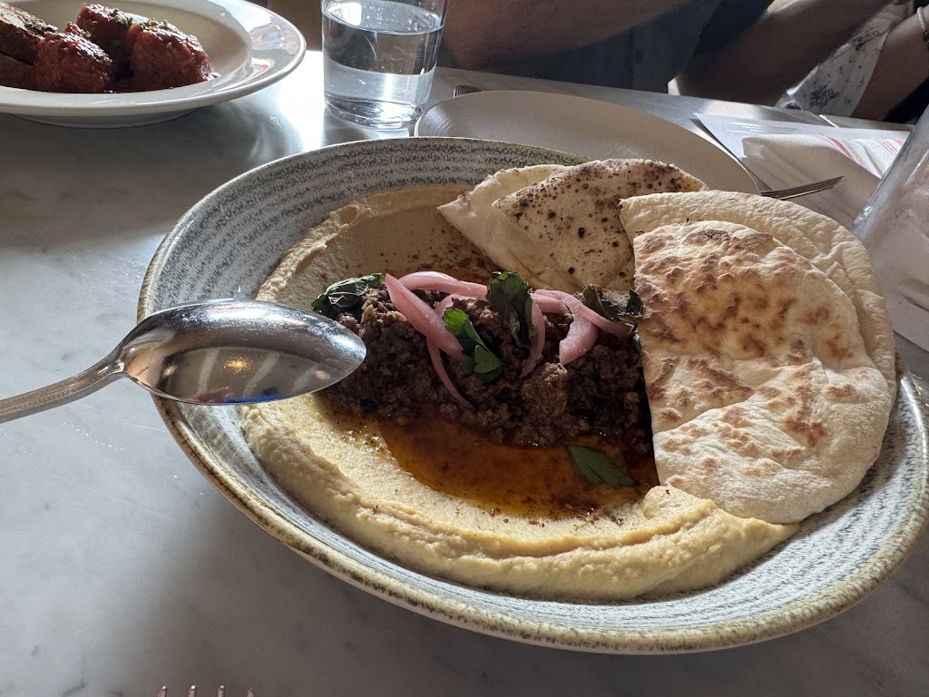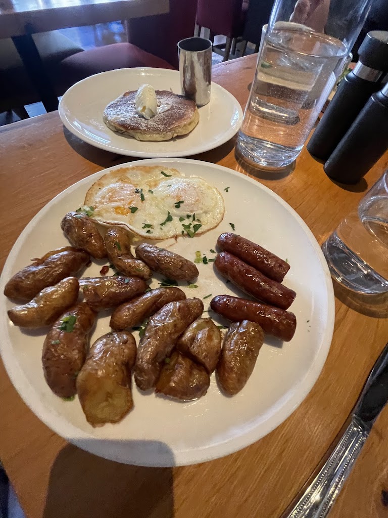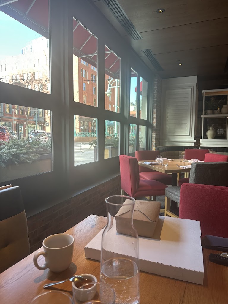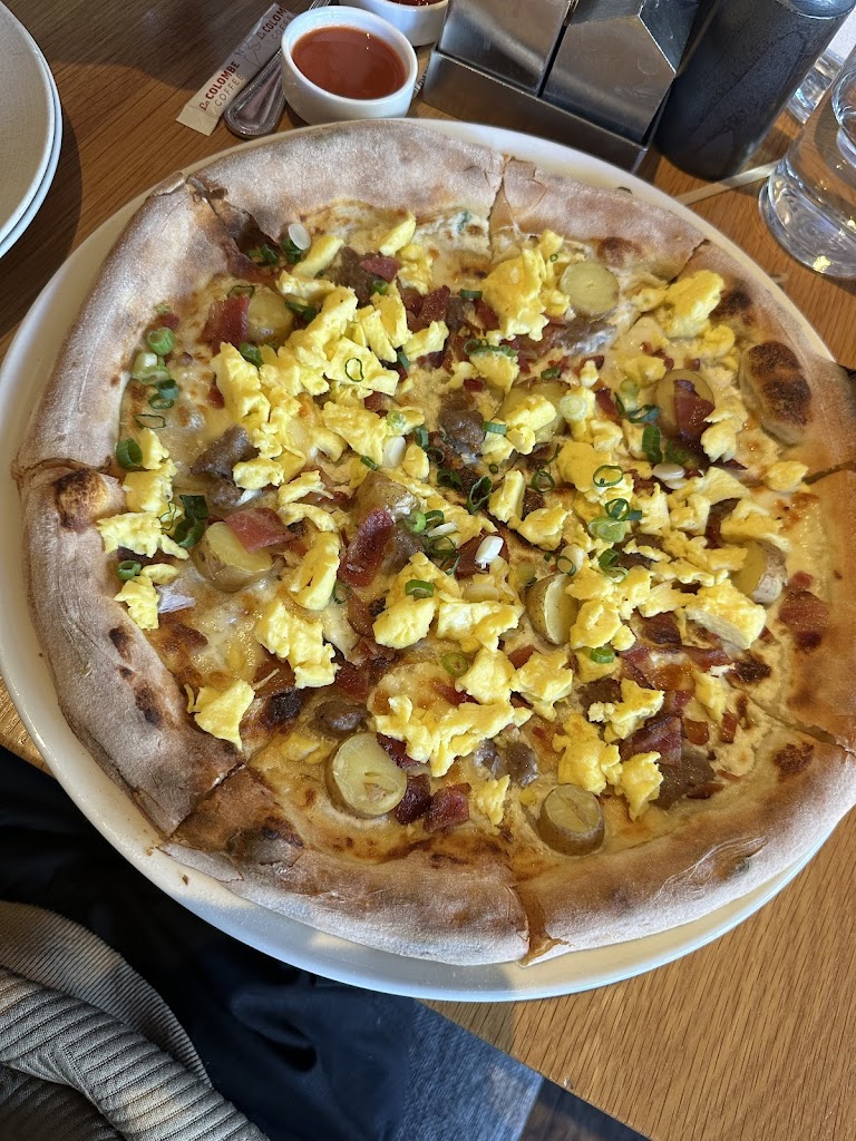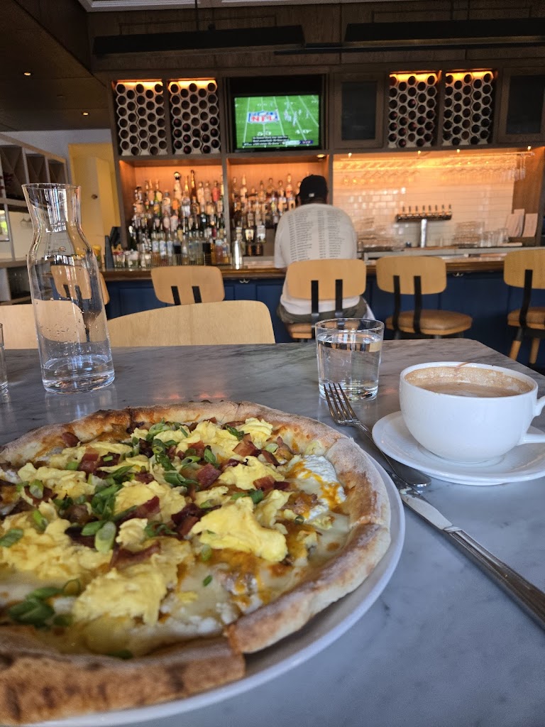 We had lunch on Friday afternoon, the Aperol spritz was really wonderful. Then we split the chicken kebab and the chicken sandwich - so flavorful! Our server Sean was excellent! Then breakfast the next morning - whoa! the breakfast pizza was the BEST! Our server Drew was so excellent. We took the other half of the pizza home and had it the next morning. Might have tasted even better the second day!