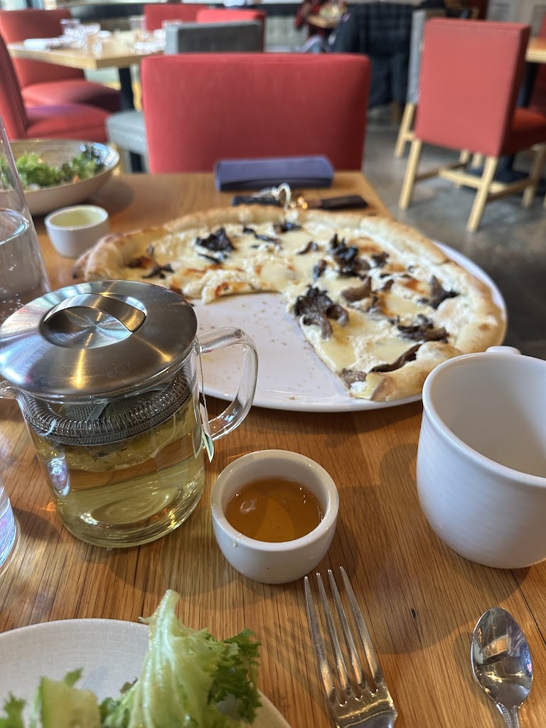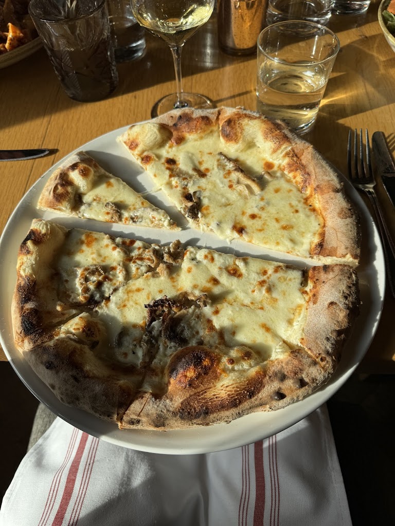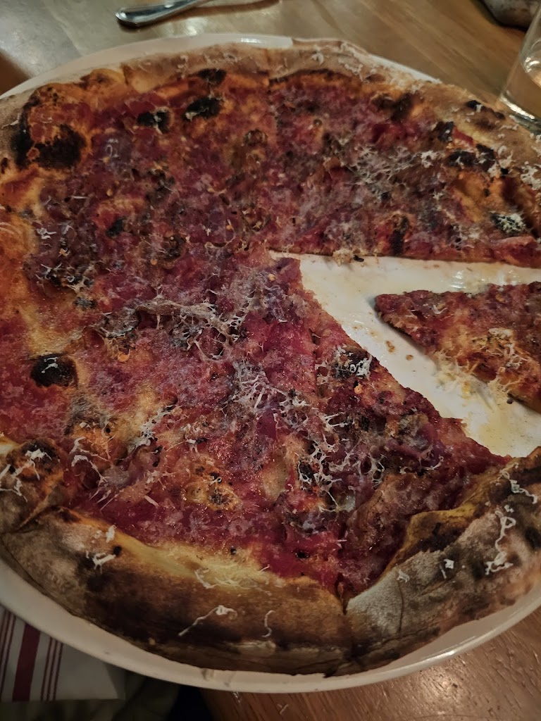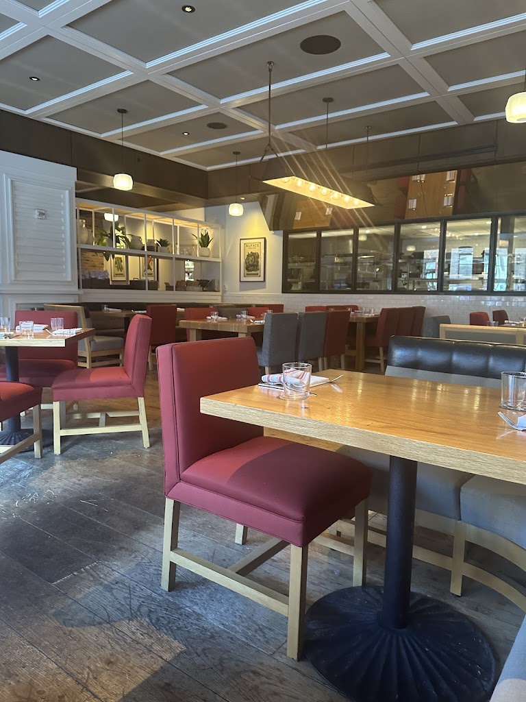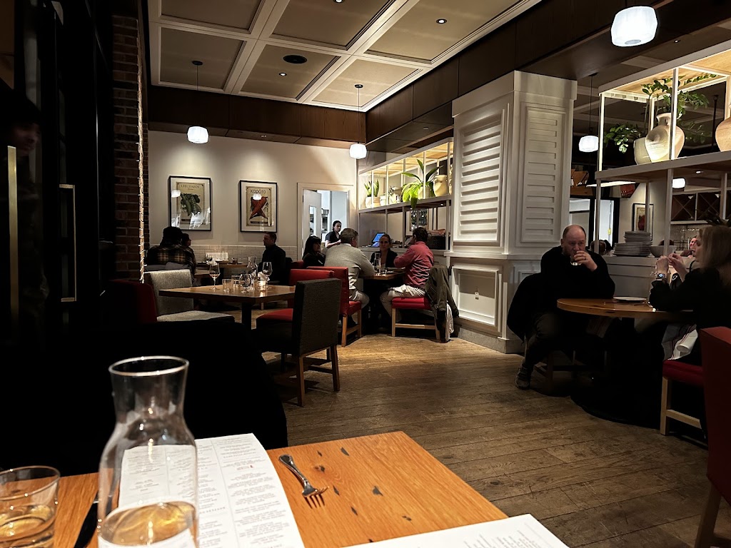 My favorite go to lunch and dinner place. The manager John is amazing and the head Chef often stops at our table to say hello. The waitstaff is kind and they always do their best to make sure we are satisfied. The wine menu is great and the food is delectable. Wood stove pizzas are delicious (you can smell the wood burning stove from the minute you walk through the door) and the small plates and bites are especially delicious. I’ve never had a bad experience here. I also love their menu is seasonal. Super fun since we come several times. It’s always fun to see what their new menu will include.