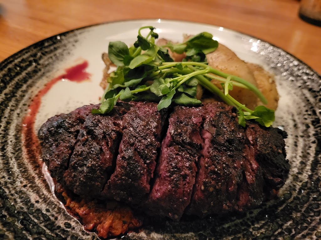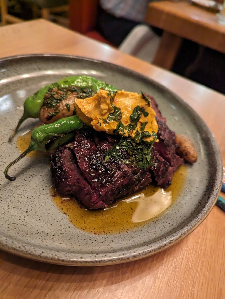 My partner got the hangar steak featuring fingerling potatoes, summer peppers, chimi roja, and a calabrian chili butter, and he added sauteed mushrooms To me, it said 'Bobby Flay', who he always claims is his best friend **eye roll** haha.