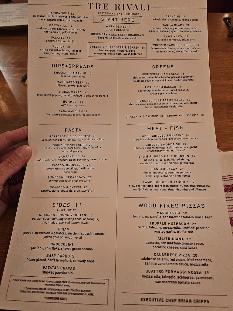 I love dining at Tre Rivali!! The food is always delicious, such a great atmosphere and good service. The octopus is always a hit and the drinks are always on point. I highly recommend eating a Tre Rivali!